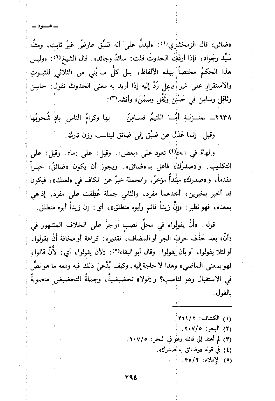 ضائق» قال الزمخشري: «ليدلَّ على أنه ضيِّق عارضٌ غيرُ ثابت، ومثلُه سَيِّد وجَواد، فإذا أردْتَ الحدوثَ قلت: سائدٌ وجائد» . قال الشيخ: «وليس هذا الحكمُ مختصاً بهذه الألفاظ، بل كلُّ ما بُني من الثلاثي للثبوتِ والاستقرارِ على غير فاعِل رُدَّ إليه إذا أريد به معنى الحدوث تقول: حاسِن وثاقِل وسامِن في حَسُن وثَقُل وسَمُنَ» وأنشد: