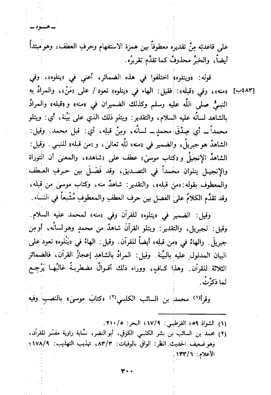 وقيل: الضمير في «يتلوه» للقرآن وفي «منه» لمحمد عليه السلام. وقيل: لجبريل، والتقدير: ويتلو القرآنَ شاهدٌ من محمدٍ وهو لسانُه، أو مِن جبريلَ. والهاءُ في «من قبلِه» أيضاً للقرآن. وقيل: الهاءُ في «يَتْلوه» تعود على البيان المدلولِ عليه بالبيِّنة. وقيل: المرادُ بالشاهدِ إعجازُ القرآن، فالضمائر الثلاثة للقرآن. وهذا كافٍ، ووراء ذلك أقوالٌ مضطربةٌ غالبُها يَرْجِع لما ذكرْتُ.