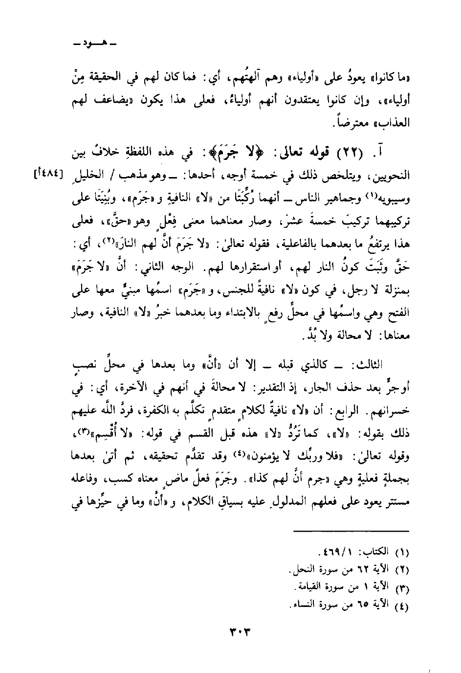 الثالث: كالذي قبله إلا أن «أنَّ» وما بعدها في محلِّ نصبٍ أو جرٍّ بعد حذف الجار، إذ التقدير: لا محالةَ في أنهم في الآخرة، أي: في خسرانهم. الرابع: أن «لا» نافيةٌ لكلامٍ متقدمٍ تكلَّم به الكفرة، فردَّ اللَّه عليهم ذلك بقولِه: «لا» ، كما تَرُدُّ «لا» هذه قبل القسم في قوله: {لاَ أُقْسِمُ} [القيامة: 1] ، وقوله تعالى: {فَلاَ وَرَبِّكَ لاَ يُؤْمِنُونَ} [النساء: 65] وقد تقدَّم تحقيقه، ثم أتى بعدها بجملةٍ فعليةٍ وهي «جرم أنَّ لهم كذا» . وجَرَمَ فعلٌ ماضٍ معناه كسب، وفاعله مستتر يعود على فعلهم المدلولِ عليه بسياقِ الكلام، و «أنَّ» وما في حيِّزها في