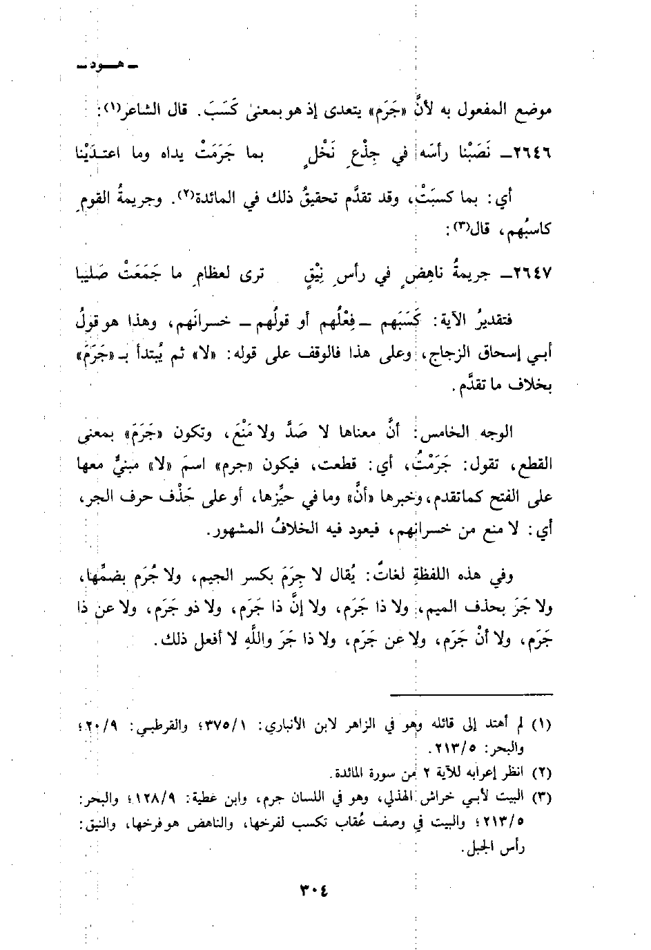 الوجه الخامس: أنَّ معناها لا صَدَّ ولا مَنْعَ، وتكون «جَرَمَ» بمعنى القطع، تقول: جَرَمْتُ، أي: قطعت، فيكون «جرم» اسمَ «لا» مبنيٌّ معها على الفتح كما تقدم، وخبرها «أنَّ» وما في حيِّزها، أو على حَذْف حرف الجر، أي: لا منع من خسرانهم، فيعود فيه الخلافُ المشهور.