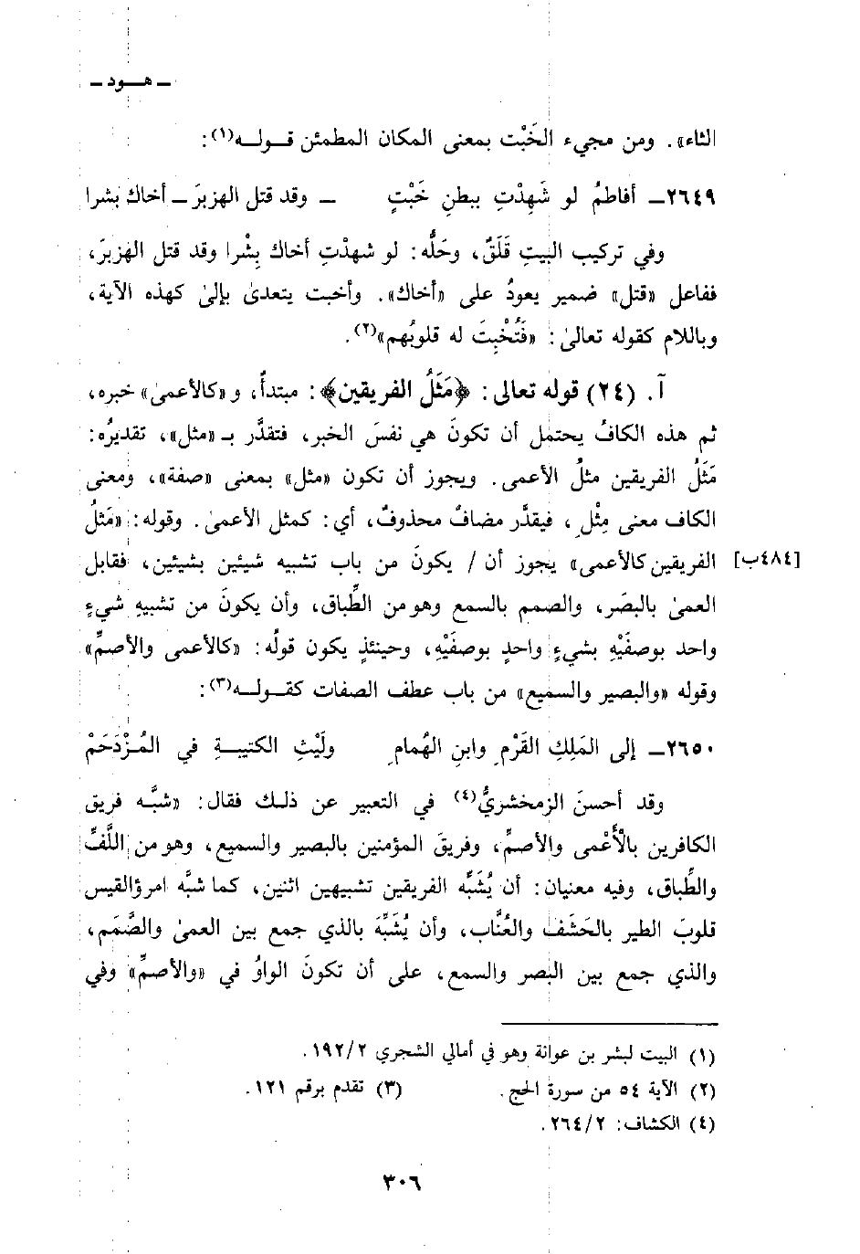 وقد أحسنَ الزمخشريُّ في التعبير عن ذلك فقال: «شبَّه فريق الكافرين بالأَعْمى والأصمِّ، وفريقَ المؤمنين بالبصير والسميع، وهو من اللَّفِّ والطِّباق، وفيه معنيان: أن يُشَبِّه الفريقين تشبيهين اثنين، كما شبَّه امرؤ القيس قلوبَ الطير بالحَشَف والعُنَّاب، وأن يُشَبِّهَ بالذي جمع بين العمى والصَّمَم، والذي جمع بين البصر والسمع، على أن تكونَ الواوُ في» والأصمِّ «وفي»