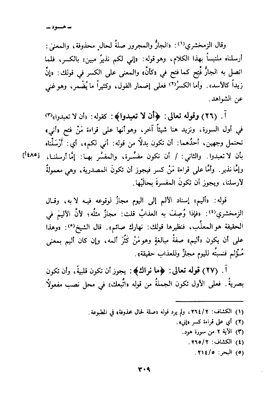 وقوله تعالى: {أَن لاَّ تعبدوا} : كقوله: {أَن لاَّ تعبدوا} في أول السورة، ونزيد هنا شيئاً آخر، وهو أنها على قراءة مَنْ فتح «أني» تحتمل وجهين، أحدُهما: أن تكون بدلاً من قوله: «أني لكم» ، أي: أَرْسَلْناه بأن لا تعبدوا. والثاني: / أن تكون مفسِّرة، والمفسَّر بها: إمَّا أرسلنا، وإمَّا نذير. وأمَّا على قراءة مَنْ كسر فيجوز أن تكونَ المصدرية، وهي معمولةٌ لأرسلنا، ويجوز أن تكونَ المفسرةَ بحالَيْها.