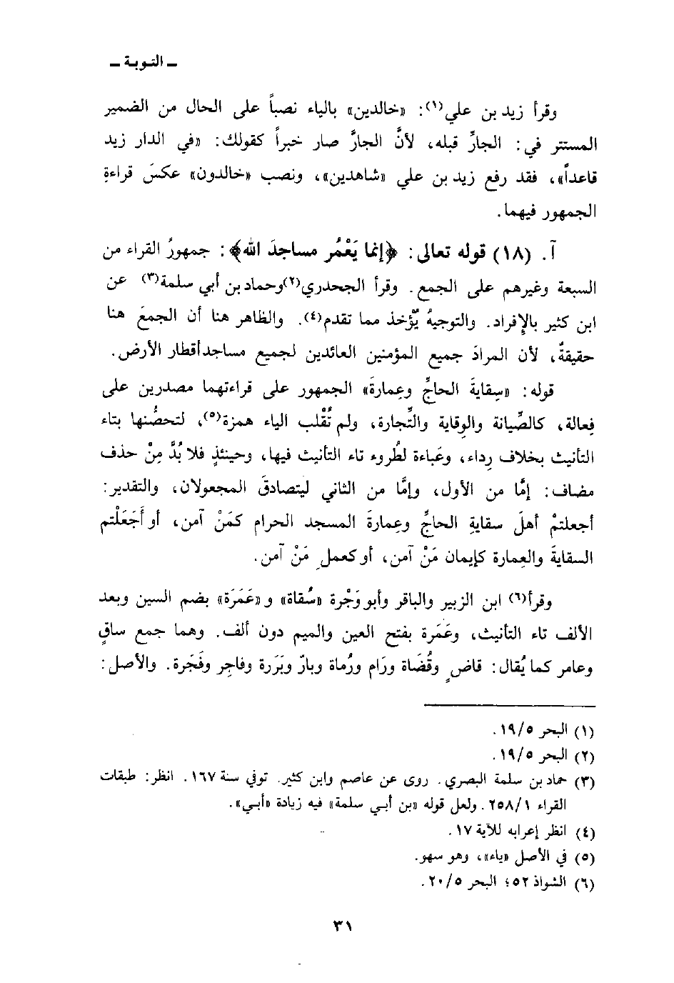 وقرأ ابن الزبير والباقر وأبو وَجْرة «سُقاة» و «عَمَرَة» بضم السين وبعد الألف تاء التأنيث، وعَمَرة بفتح العين والميم دون ألف. وهما جمع ساقٍ وعامر كما يُقال: قاضٍ وقُضَاة ورَام ورُماة وبارّ وبَرَرة وفاجِر وفَجَرة. والأصل: