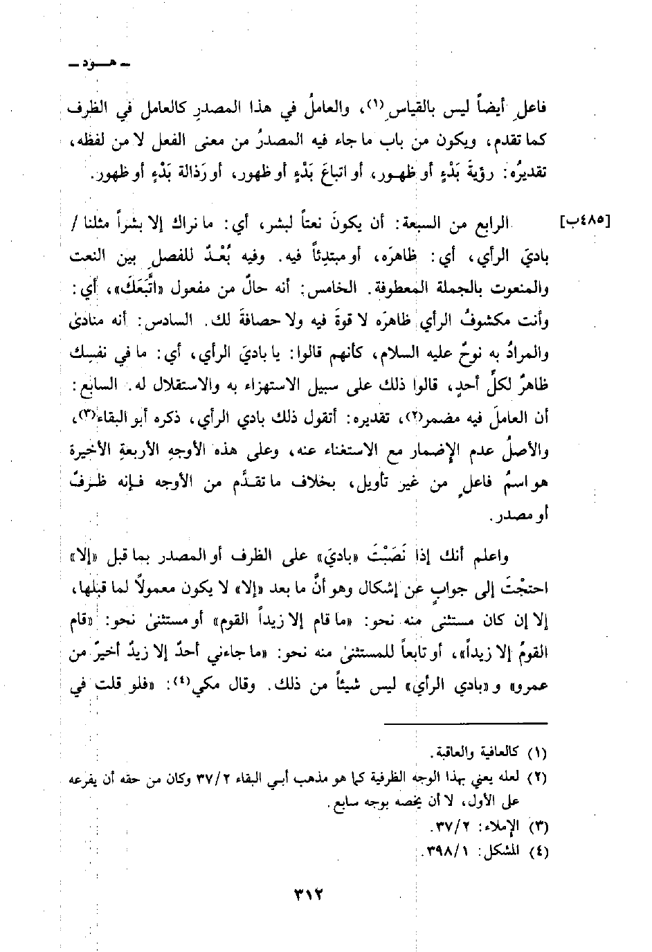 واعلم أنك إذا نَصَبْتَ «باديَ» على الظرف أو المصدر بما قبل «إلا» احتجْتَ إلى جوابٍ عن إشكال وهو أنَّ ما بعد «إلا» لا يكون معمولاً لما قبلها، إلا إن كان مستثنى منه نحو: «ما قام إلا زيداً القوم» أو مستثنى نحو: «قام القومُ إلا زيداً» ، أو تابعاً للمستثنى منه نحو: «ما جاءني أحدُ إلا زيدٌ أخيرٌ من عمرو» و «بادي الرأي» ليس شيئاً من ذلك. وقال مكي: «فلو قلت في