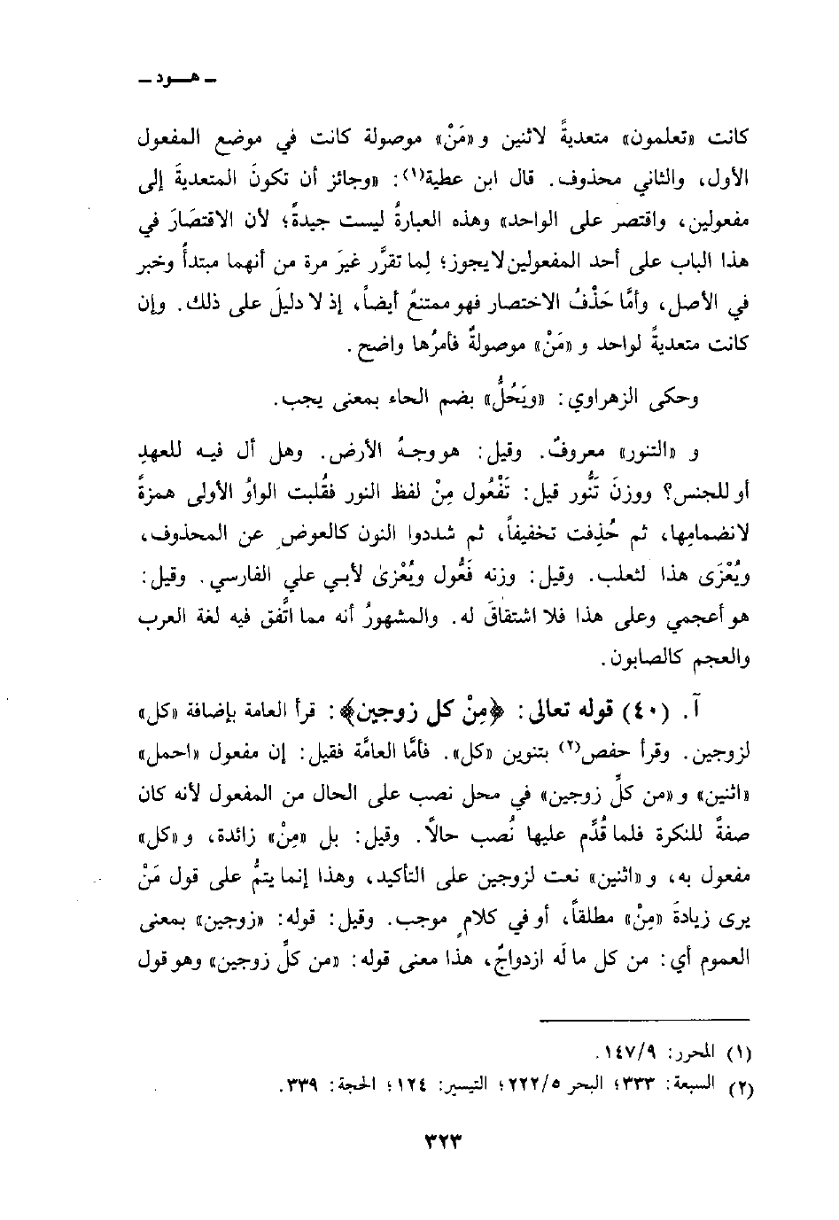 قوله تعالى: {مِن كُلٍّ زَوْجَيْنِ} : قرأ العامة بإضافة «كل» لزوجين. وقرأ حفص بتنوين «كل» . فأمَّا العامَّة فقيل: إن مفعول «احمل» «اثنين» و {مِن كُلٍّ زَوْجَيْنٍ} في محل نصب على الحال من المفعول لأنه كان صفةً للنكرة فلما قُدِّم عليها نُصب حالاً. وقيل: بل «مِنْ» زائدة، و «كل» مفعول به، و «اثنين» نعت لزوجين على التأكيد، وهذا إنما يتمُّ على قول مَنْ يرى زيادةَ «مِنْ» مطلقاً، أو في كلامٍ موجب. وقيل: قوله: «زوجين» بمعنى العموم أي: من كل ما لَه ازدواجٌ، هذا معنى قوله: {مِن كُلٍّ زَوْجَيْنٍ} وهو قول