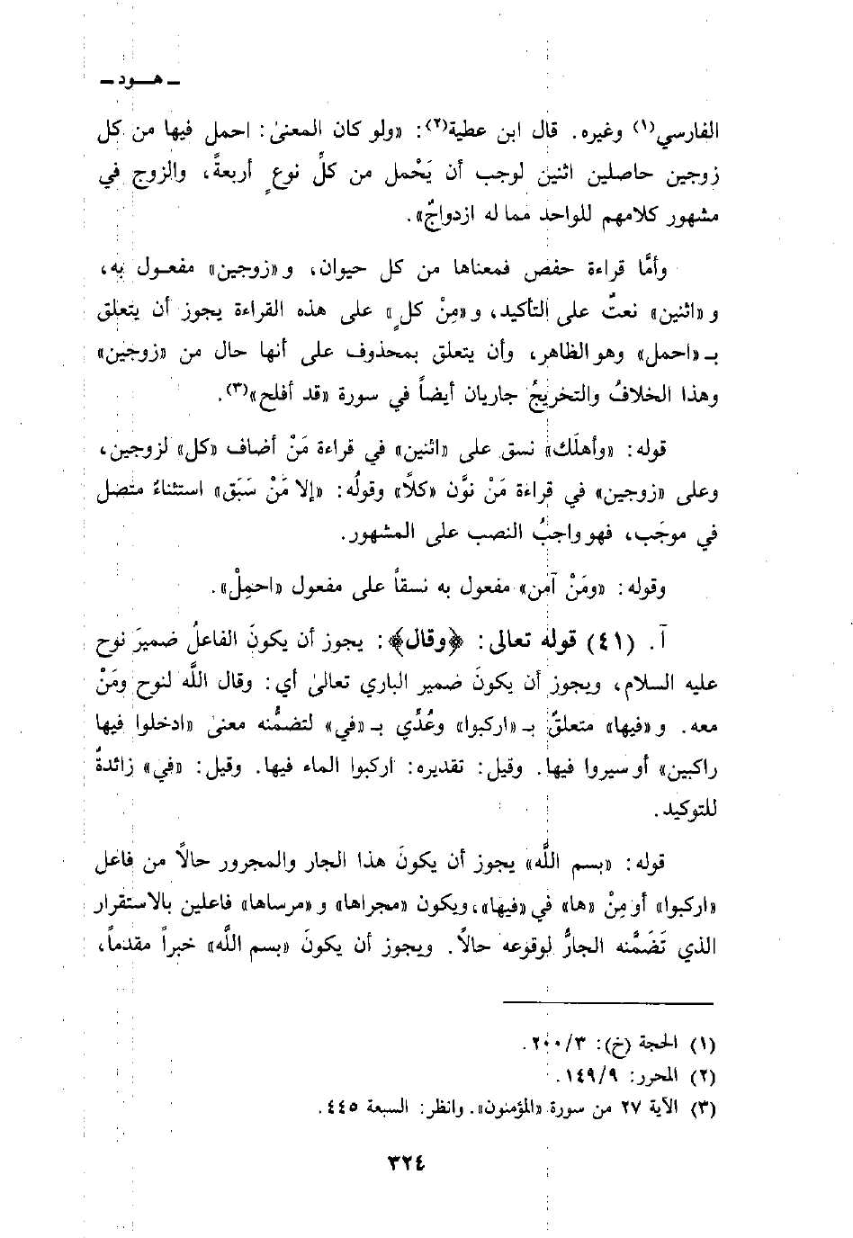 الفارسي وغيره. قال ابن عطية: «ولو كان المعنى: احمل فيها من كل زوجين حاصلين اثنين لوجب أن يَحْمل من كلِّ نوعٍ أربعةً، والزوج في مشهور كلامهم للواحد مما له ازدواجٌ» .