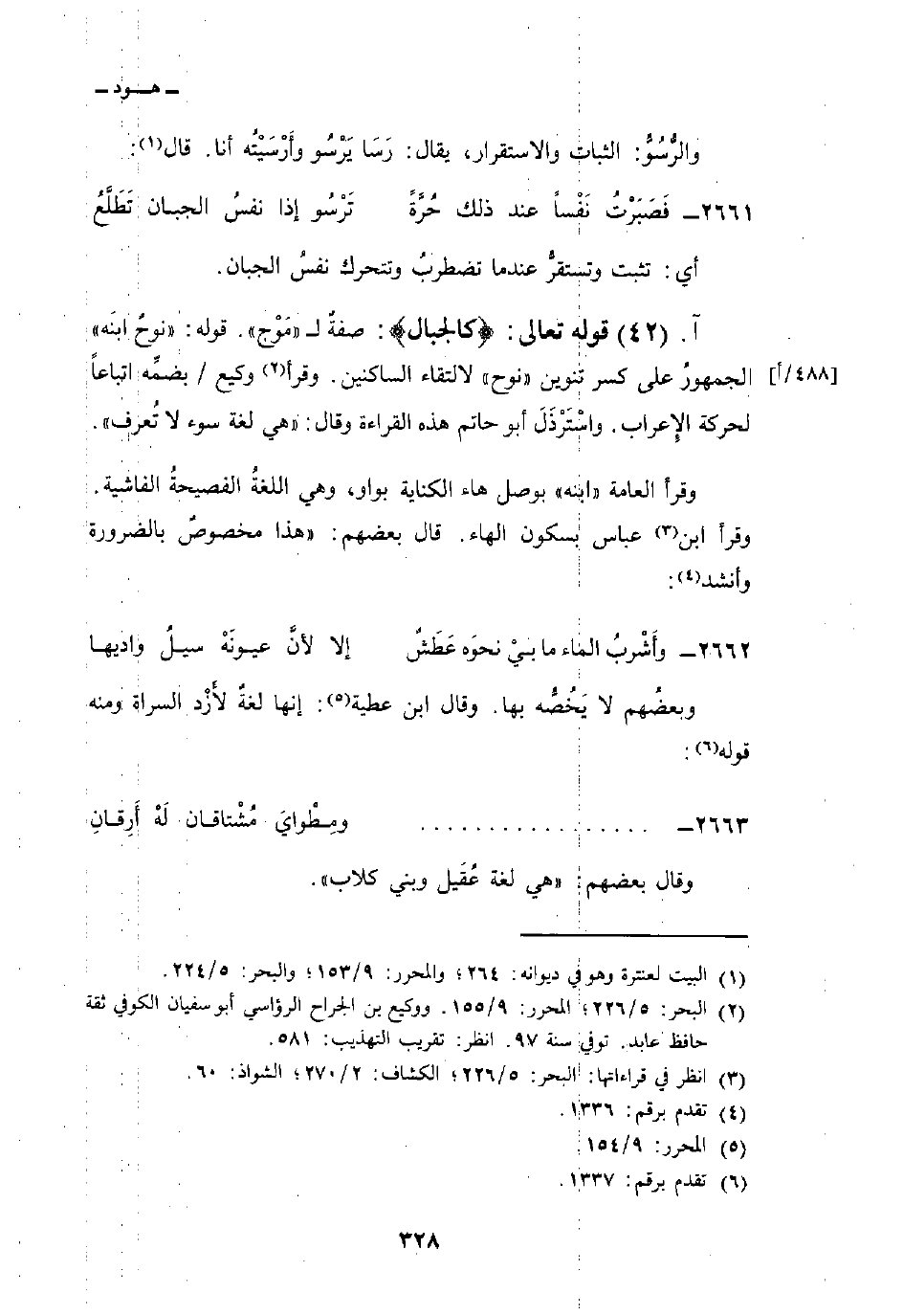 قوله تعالى: {كالجبال} : صفةٌ ل «مَوْج» . قوله: «نوحٌ ابنَه» الجمهورُ على كسر تنوين «نوح» لالتقاء الساكنين. وقرأ وكيع/ بضمِّه اتباعاً لحركة الإِعراب. واسْتَرْذَلَ أبو حاتم هذه القراءة وقال: «هي لغة سوء لا تُعرف» .