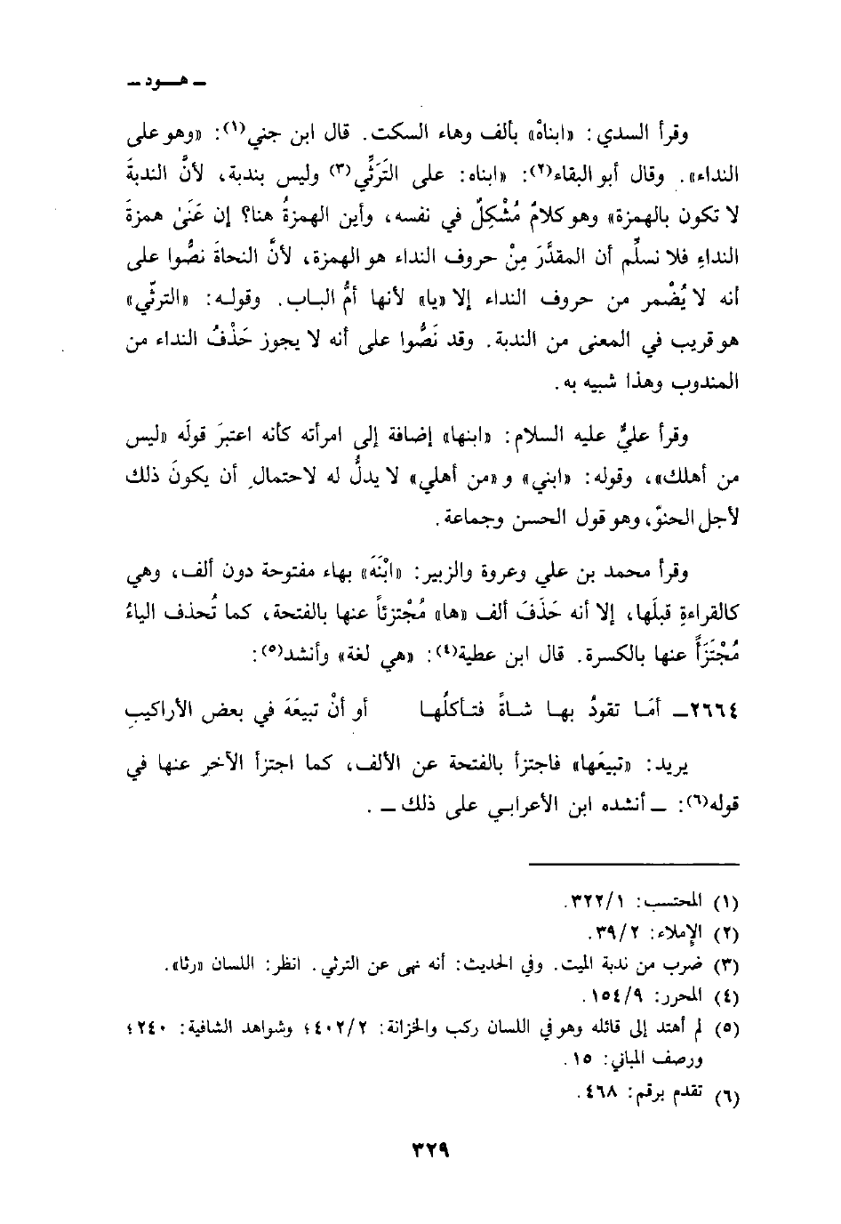 وقرأ السدي:» ابناهْ «بألف وهاء السكت. قال ابن جني:» وهو على النداء «. وقال أبو البقاء:» ابناه: على التَرَثِّي وليس بندبة، لأنَّ الندبةَ لا تكون بالهمزة «وهو كلامٌ مُشْكِلٌ في نفسه، وأين الهمزةُ هنا؟ إن عنى همزةَ النداءِ فلا نسلِّم أن المقدَّرَ مِنْ حروف النداء هو الهمزة، لأنَّ النحاةَ نصُّوا على أنه لا يُضْمر في حروف النداء إلا» يا «لأنها أمُّ الباب. وقوله:» الترثّي «هو قريب في المعنى من الندبة. وقد نَصُّوا على أنه لا يجوز حَذْفُ النداء من المندوب وهذا شبيه به.