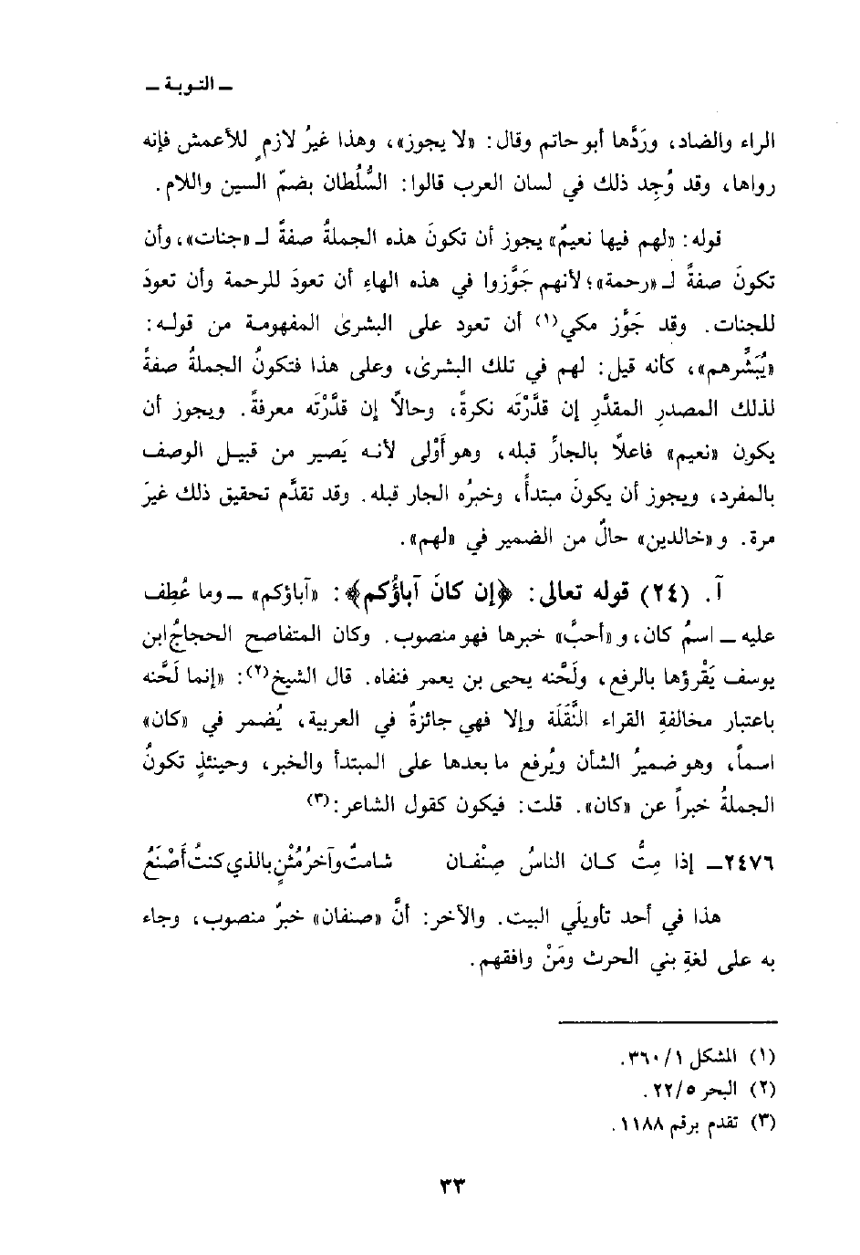 قوله تعالى: {إِن كَانَ آبَاؤُكُمْ} : «آباؤكم» وما عُطِف عليه اسمُ كان، و «أحبَّ» خبرها فهو منصوب. وكان المتفاصح الحجاجُ ابن يوسف يَقْرؤها بالرفع، ولَحَّنه يحيى بن يعمر فنفاه. قال الشيخ: «إنما لَحَّنه باعتبار مخالفةِ القراء النَّقَلَة وإلا فهي جائزةٌ في العربية، يُضمر في» كان «اسماً، وهو ضميرُ الشأن ويُرفع ما بعدها على المبتدأ والخبر، وحينئذٍ تكونُ الجملةُ خبراً عن» كان «. قلت: فيكون كقول الشاعر: