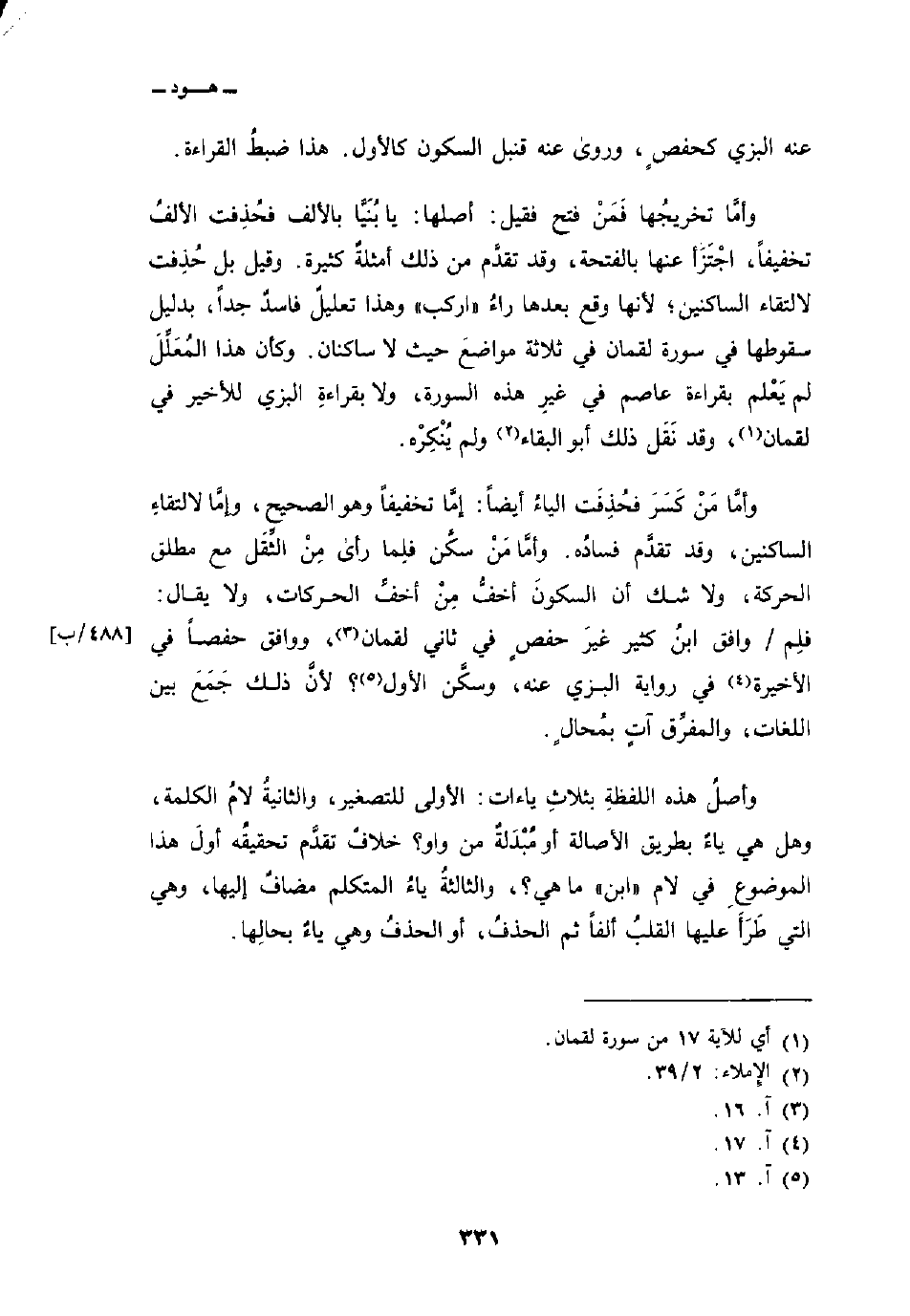 وأمَّا مَنْ كَسَرَ فحُذِفَت الياءُ أيضاً: إمَّا تخفيفاً وهو الصحيح، وإمَّا لالتقاءِ الساكنين، وقد تقدَّم فسادُه. وأمَّا مَنْ سكَّن فلِما رأى مِنْ الثِّقَل مع مطلق الحركة، ولا شك أن السكونَ أخفُّ مِنْ أخفِّ الحركات، ولا يقال: فلِم/ وافق ابنُ كثير غيرَ حفصٍ في ثاني لقمان، ووافق حفصاً في الأخيرة في رواية البزي عنه، وسكَّن الأول؟ لأنَّ ذلك جَمَعَ بين اللغات، والمفرِّق آتٍ بمُحالٍ.