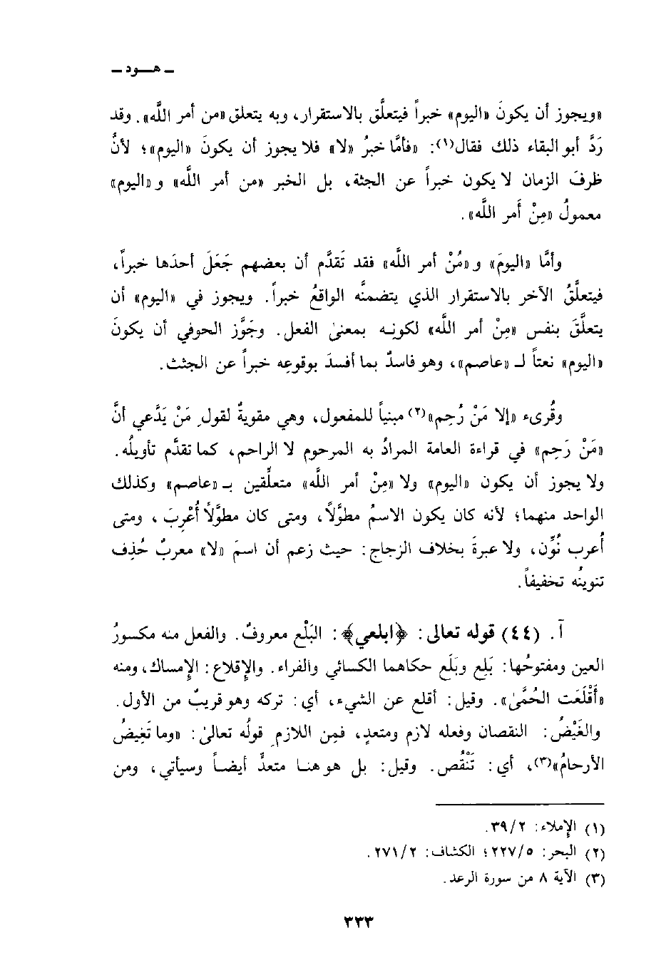 ويجوز أن يكونَ «اليوم» خبراً فيتعلَّق قالاستقرار، وبه يتعلق {مِنْ أَمْرِ الله} . وقد رَدَّ أبو البقاء ذلك فقال: «فأمَّا خبرُ» لا «فلا يجوز أن يكونَ» اليوم «؛ لأنَّ ظرفَ الزمان لا يكون خبراً عن الجثة، بل الخبر {مِنْ أَمْرِ الله} و» اليوم «معمولُ {مِنْ أَمْرِ الله} .