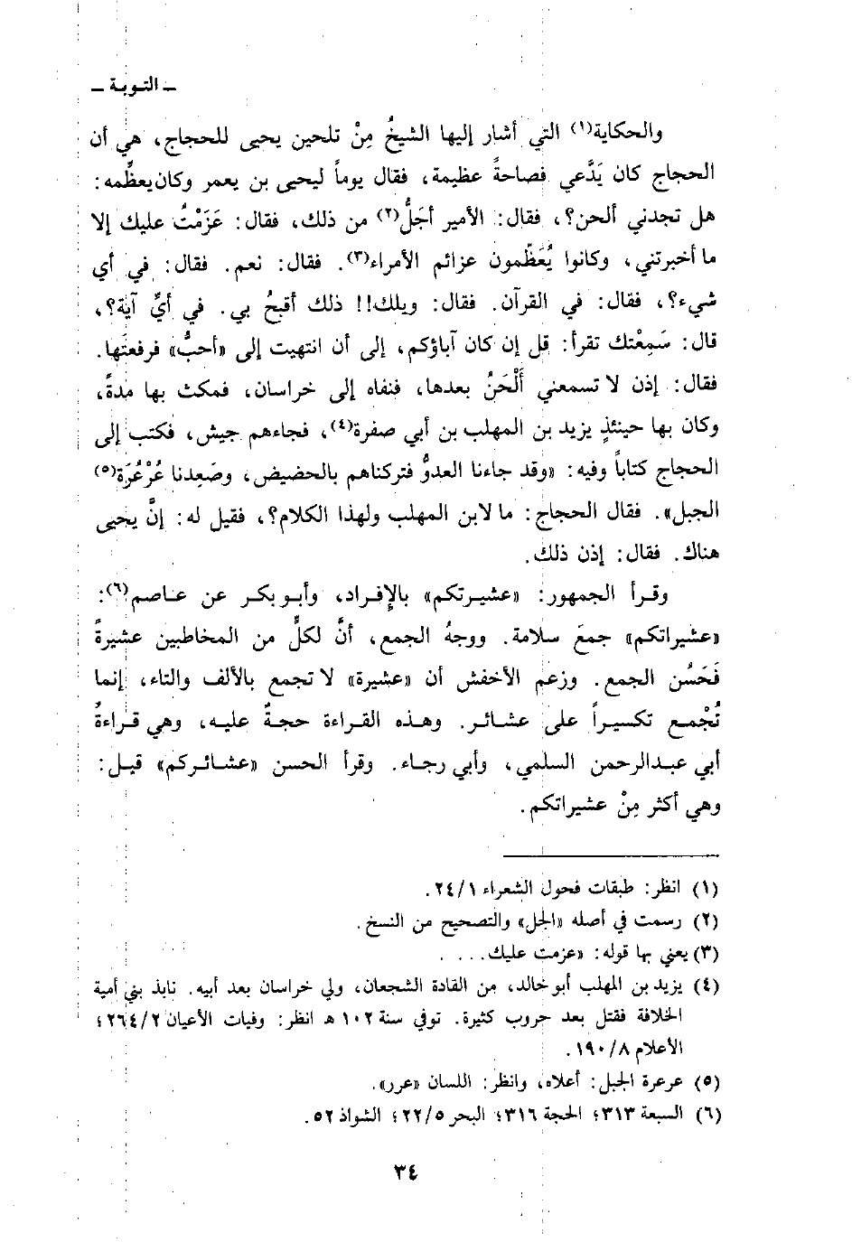 والحكاية التي أشار إليها الشيخُ مِنْ تلحين يحيى للحجاج، هي أن الحجاج كان يَدَّعي فصاحةً عظيمة، فقال يوماً ليحيى بن يعمر وكان يعظِّمه: هي تجدني ألحن؟ ، فقال: الأمير أجَلُّ من ذلك، فقال: عَزَمْتُ عليك إلا ما أخبرتني وكان يُعَظّمون عزائم الأمراء. فقال: نعم. فقال: في أي شيء؟ ، فقال: في القرآن. فقال: ويلك!! ذلك أقبحُ بي. في أيِّ آية؟ ، قال: سَمِعْتك تقرأ: قل إن كان آباؤكم، إلى أن انتهيت إلى» أحبُّ «فرفعتَها. فقال: إذن لا تسمعني أَلْحَنُ بعدها، فنفاه إلى خراسان، فمكث بها مدةً، وكان بها حينئذٍ يزيد بن المهلب بن أبي صفرة، فجاءهم جيش، فكتب إلى الحجاج كتاباً وفيه:» وقد جاءنا العدوُّ فتركناهم بالحضيض، وصَعِدنا عُرْعُرَة الجبل «. فقال الحجاج: ما لابن المهلب ولهذا الكلام؟ ، فقيل له: إنَّ يحيى هناك. فقال: إذن ذلك.