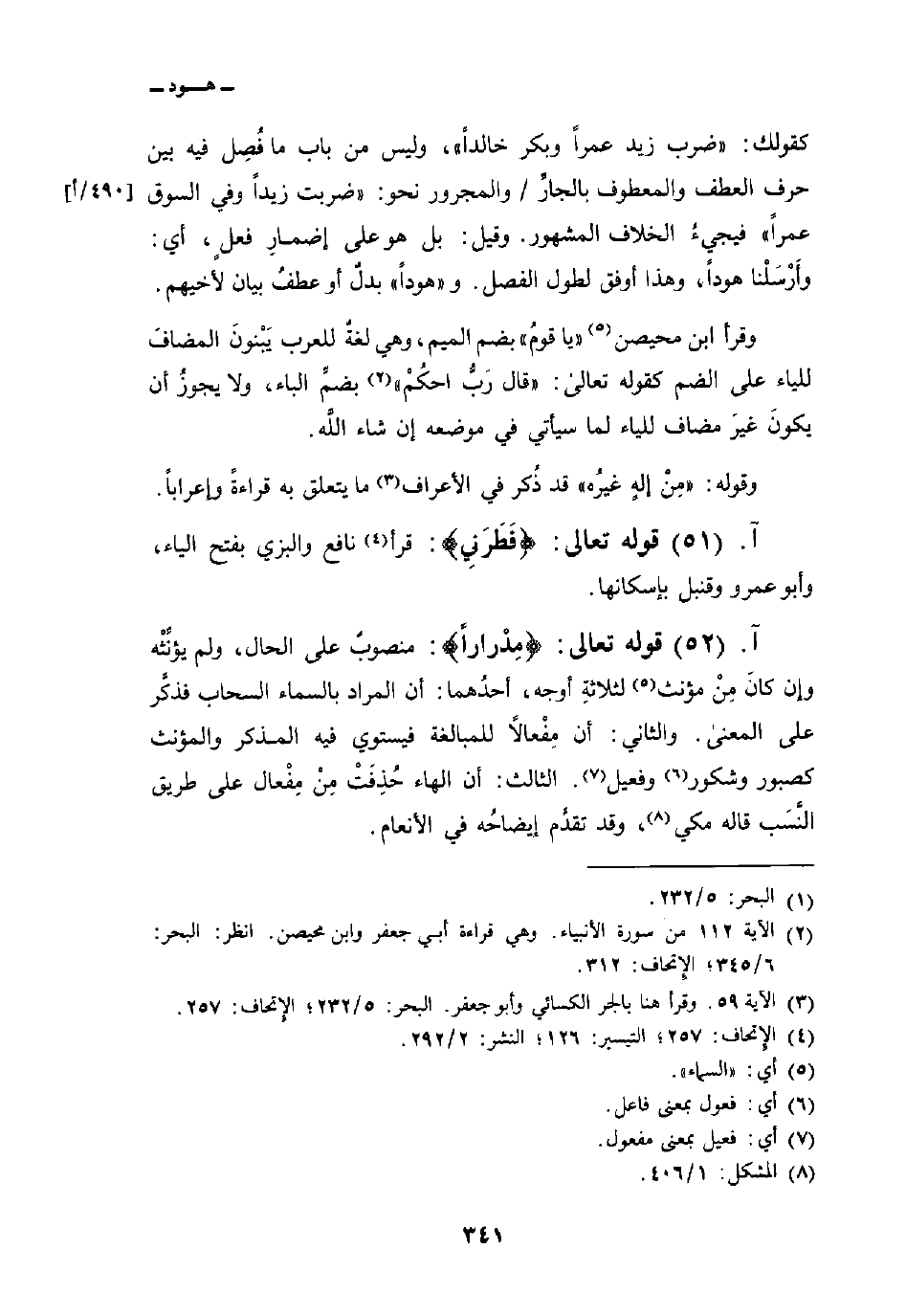 كقولك: «ضرب زيد عمراً وبكر خالداً» ، وليس من باب ما فُصِل فيه بين حرف العطف والمعطوف بالجارِّ/ والمجرور نحو: «ضربت زيداً وفي السوق عمراً» فيجيءُ الخلاف المشهور. وقيل: بل هو على إضمارِ فعلٍ، أي: وأَرْسَلْنا هوداً، وهذا أوفق لطول الفصل. و «هوداً» بدلٌ أو عطفٌ بيان لأخيهم.