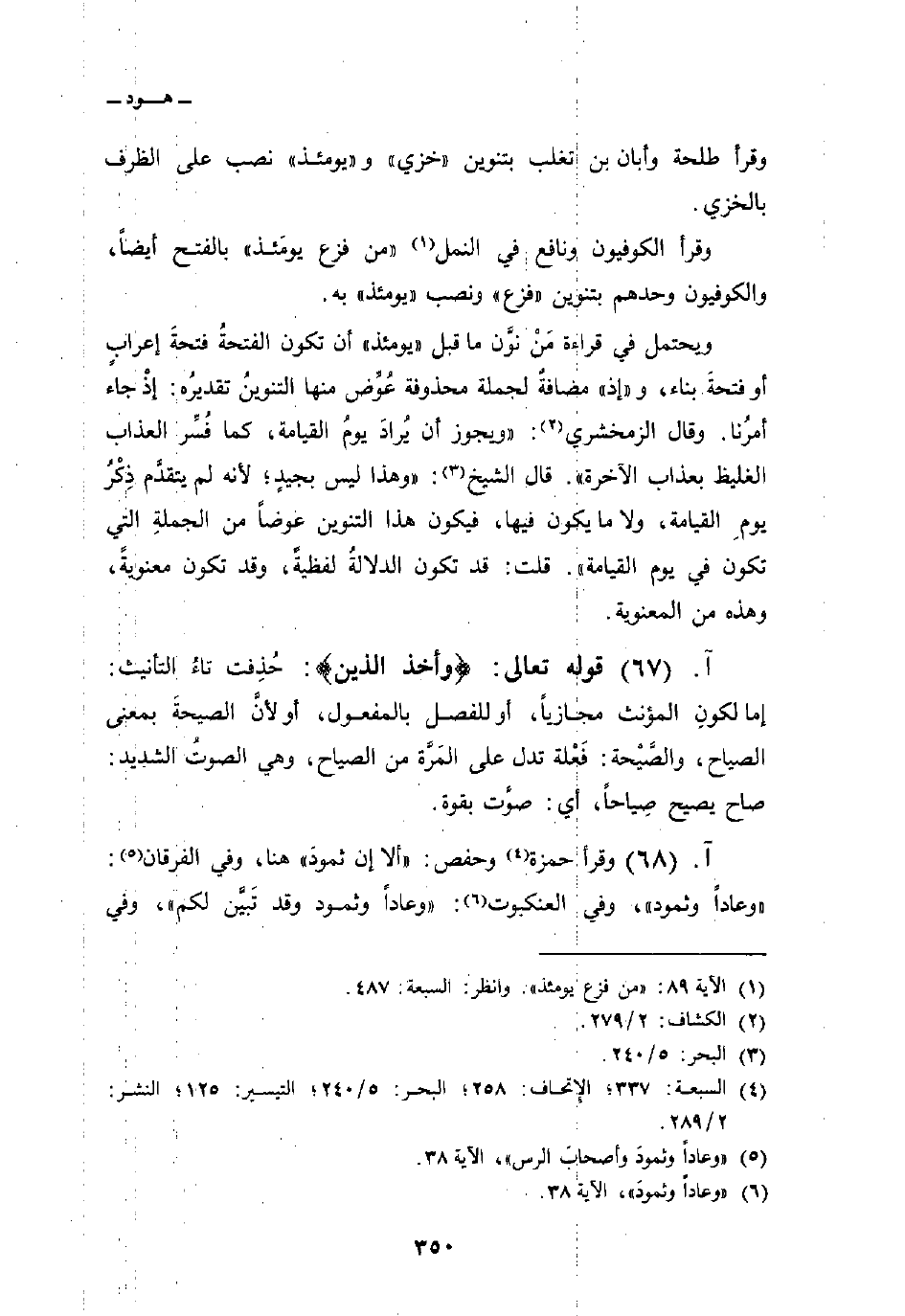 ويحتمل في قراءة مَنْ نوَّن ما قبل» يومئذ «أن تكون الفتحةُ فتحةَ إعرابٍ أو فتحةَ بناء، و» إذ «مضافةٌ لجملة محذوفة عُوِّض منها التنوينُ تقديرُه: إذْ جاء أمرُنا. وقال الزمخشري:» ويجوز أن يُراد يومُ القيامة، كما فُسِّر العذاب الغليظ بعذاب الآخرة «. قال الشيخ:» وهذا ليس بجيدٍ؛ لأنه لم يتقدَّم ذِكْرُ يومِ القيامة، ولا ما يكون فيها، فيكون هذا التنوين عوضاً من الجملةِ التي تكون في يوم القيامة «. قلت: قد تكون الدلالةُ لفظيةً، وقد تكون معنويةً وهذه من المعنوية.