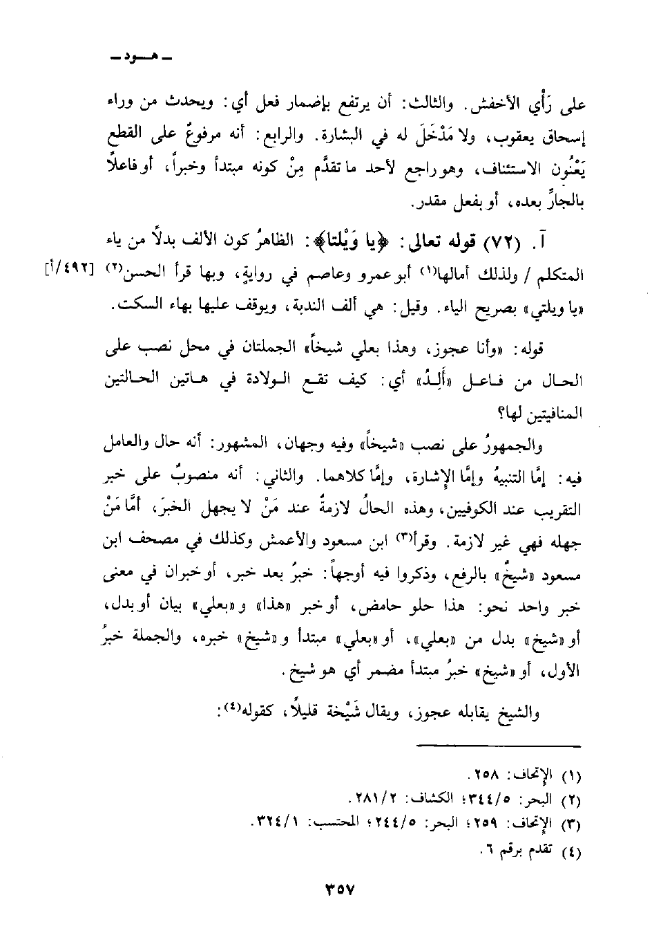 قوله: {وَأَنَاْ عَجُوزٌ وهذا بَعْلِي شَيْخاًٌ} الجملتان في محل نصب على الحال من فاعل «أَلِدُ» أي: كيف تقع الولادة في هاتين الحالتين المنافيتين لها؟