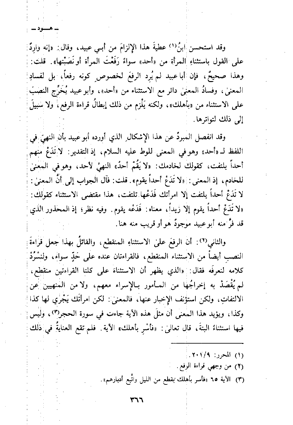 وقد استحسن ابنُ عطيةَ هذا الإِلزامَ من أبي عبيد، وقال: «إنه وارِدٌ على القول باستثناءِ المرأة من» أحد «سواءً رَفَعْتَ المرأة أو نَصَبْتها» . قلت: وهذا صحيحٌ، فإن أبا عبيد لم يُرِد الرفعَ لخصوصِ كونه رفعاً، بل لفسادِ المعنى، وفسادُ المعنى دائر مع الاستثناء من «أحد» ، وأبو عبيد يُخَرِّج النصبَ على الاستثناء من «بأهلك» ، ولكنه يَلْزم من ذلك إبطالُ قراءة الرفع، ولا سبيلَ إلى ذلك لتواترها.