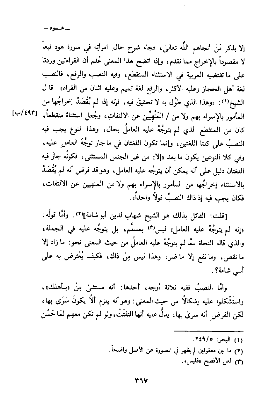إلا بذكر مَنْ أنجاهم اللَّه تعالى، فجاء شرح حالِ امرأتِه في سورة هود تبعاً لا مقصوداً بالإِخراج مما تقدم، وإذا اتضح هذا المعنى عُلم أن القراءتين وردتا على ما تقتضيه العربية في الاستثناء المنقطع، وفيه النصب والرفع، فالنصب لغة أهل الحجاز وعليه الأكثر، والرفع لغة تميم وعليه اثنان من القراء «. قال الشيخ:» وهذا الذي طوَّل به لا تحقيقَ فيه، فإنه إذا لم يُقْصَدْ إخراجُها من المأمور بالإِسراء بهم ولا من/ المَنْهِيِّين عن الالتفاتِ، وجُعل استثناءً منقطعاً، كان من المنقطع الذي لم يتوجَّهْ عليه العاملُ بحال، وهذا النوع يجب فيه النصبُ على كلتا اللغتين، وإنما تكون اللغتان في ما جاز توجُّهُ العاملِ عليه، وفي كلا النوعين يكون ما بعد «إلا» من غير الجنس المستثنى، فكونُه جازَ في اللغتان دليل على أنه يمكن أن يتوجَّه عليه العامل، وهو قد فرض أنه لم يُقْصَدْ بالاستثناء إخراجُها من المأمور بالإِسراء بهم ولا من المنهيين عن الالتفات، فكان يجب فيه إذ ذاك النصبُ قولاً واحداً «.