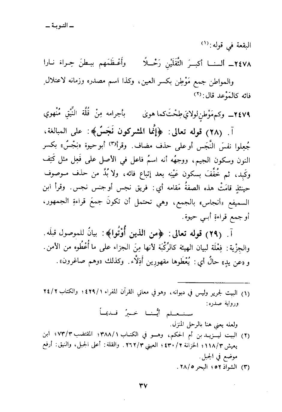 قوله تعالى: {إِنَّمَا المشركون نَجَسٌ} : على المبالغة، جُعِلوا نفسَ النَّجَس أو على حذف مضاف. وقرأ أبو حيوة «نِجْسٌ» بكسر النون وسكون الجيم، ووجهُه أنه اسمُ فاعل في الأصل على فَعِل مثل كَتِف وكَبِد، ثم خُفِّفَ بسكون عَيْنِه بعد إتباع فائه، ولا بُدَّ من حذف موصوف حينئذٍ قامَتْ هذه الصفةُ مَقامه أي: فريق نجس أو جنس نجس. وقرأ ابن السميفع «أنجاس» بالجمع، وهي تحتمل أن تكونَ جمعَ قراءةِ الجمهور، أو جمع قراءةِ أبي حيوة.