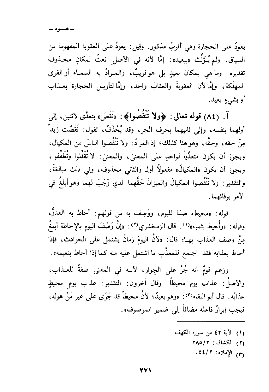 قوله تعالى: {وَلاَ تَنقُصُواْ} : «نَقَصَ» يتعدَّى لاثنين، إلى أولهما بنفسه، وإلى ثانيهما بحرف الجر، وقد يُحْذَفُ، تقول: نَقَصْت زيداً مِنْ حقَّه، وهو هنا كذلك؛ إذ المرادُ: ولا تَنْقُصوا الناسَ من المكيال، ويجوز أن يكون متعدِّياً لواحدٍ على المعنى، والمعنى: لا تُقَلِّلوا وتُطَفِّفوا، ويجوز أن يكون «المكيالَ» مفعولاً أول والثاني محذوف، وفي ذلك مبالغة، والتقدير: ولا تَنْقُصوا المكيالَ والميزانَ حَقَّهما الذي وَجَبَ لهما وهو أبلغُ في الأمر بوفائهما.
