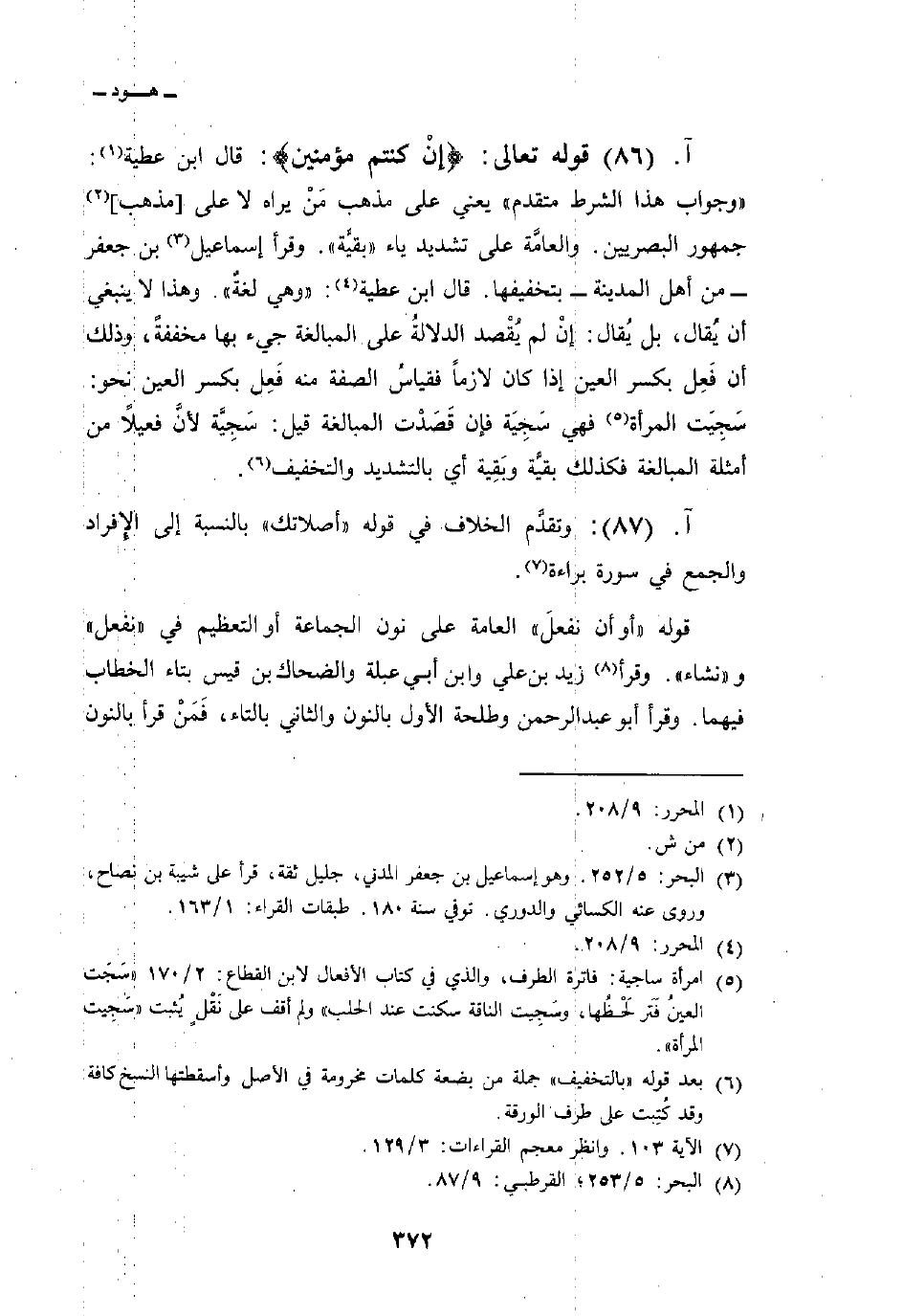 قوله تعالى: {إِن كُنتُم مُّؤْمِنِينَ} : قال ابن عطية: «وجواب هذا الشرط متقدم» يعني على مذهب مَنْ يراه لا على [مذهب] جمهور البصريين. والعامَّة على تشديد ياء «بقيَّة» . وقرأ إسماعيل بن جعفر من أهل المدينة بتخفيفها. قال ابن عطية: «وهي لغةٌ» . وهذا لا ينبغي أن يُقال، بل يُقال: إنْ لم يُقْصد الدلالةُ على المبالغة جيء بها مخففةً، وذلك أن فَعِل بكسر العين إذا كان لازماً فقياسُ الصفة منه فَعِل بكسر العين نحو: سَجِيَت المرأة فهي سَجِيَة فإن قَصَدْت المبالغة قيل: سَجِيَّة لأنَّ فعيلاً من أمثلة المبالغة فكذلك بقيَّة وبَقِية أي بالتشديد والتخفيف.