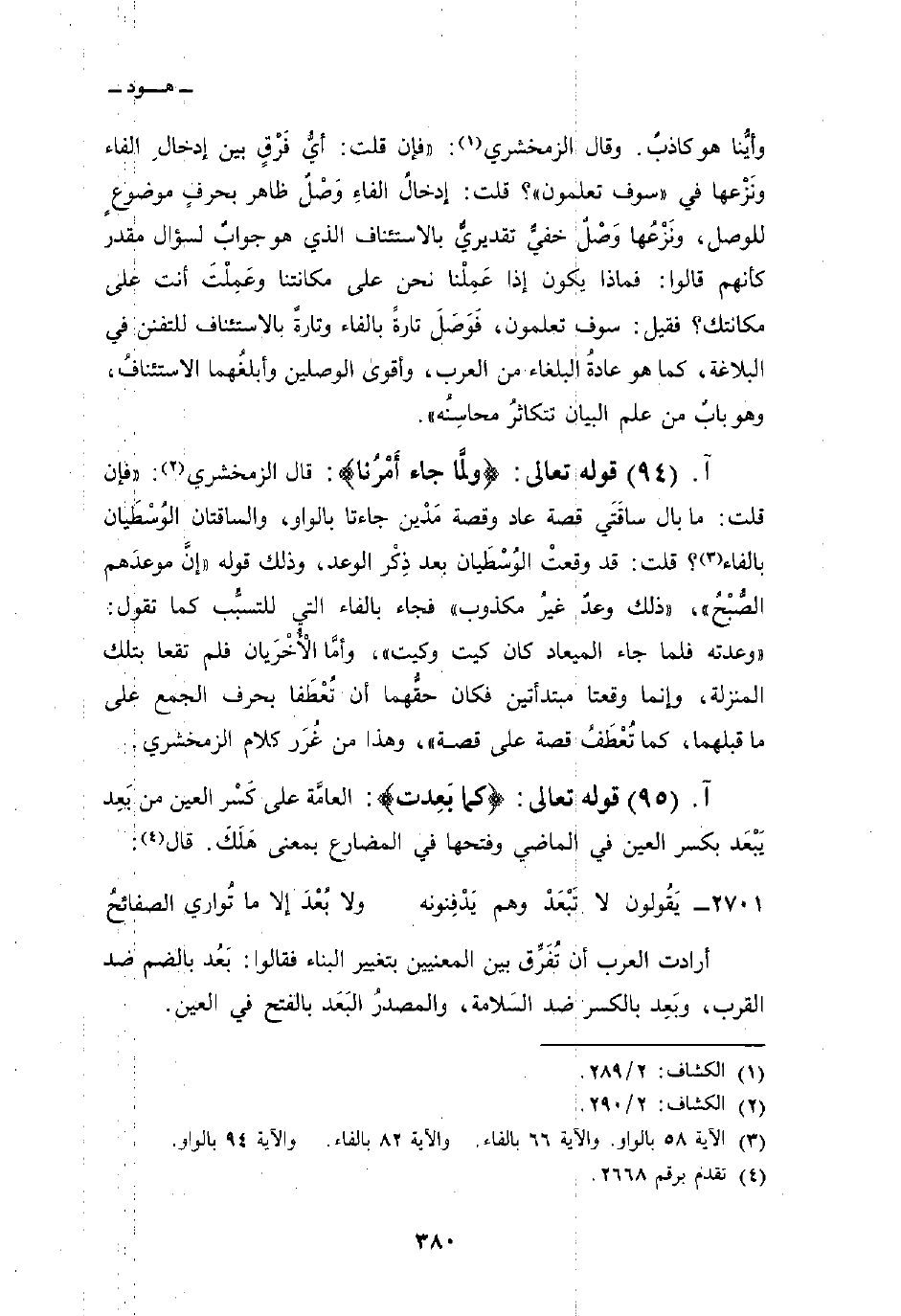 قوله تعالى: {وَلَمَّا جَآءَ أَمْرُنَا} : قال الزمخشري: «فإن قلت: ما بال ساقَتَي قصة عاد وقصة مَدْين جاءتا بالواو، والساقتان الوُسْطَيان بالفاء؟ قلت: قد وقعتْ الوُسْطَيان بعد ذِكْر الوعد، وذلك قوله {إِنَّ مَوْعِدَهُمُ الصبح} ، {ذلك وَعْدٌ غَيْرُ مَكْذُوبٍ} فجاء بالفاء التي للتسبُّب كما تقول:» وعدته فلما جاء الميعاد كان كيت وكيت «، وأمَّا الأُخْرَيان فلم تقعا بتلك المنزلة، وإنما وقعتا مبتدأتين فكان حقُّهما أن تُعْطَفا بحرف الجمع على ما قبلهما، كما تُعْطَفُ قصة على قصة» ، وهذا من غُرَر كلام الزمخشري.