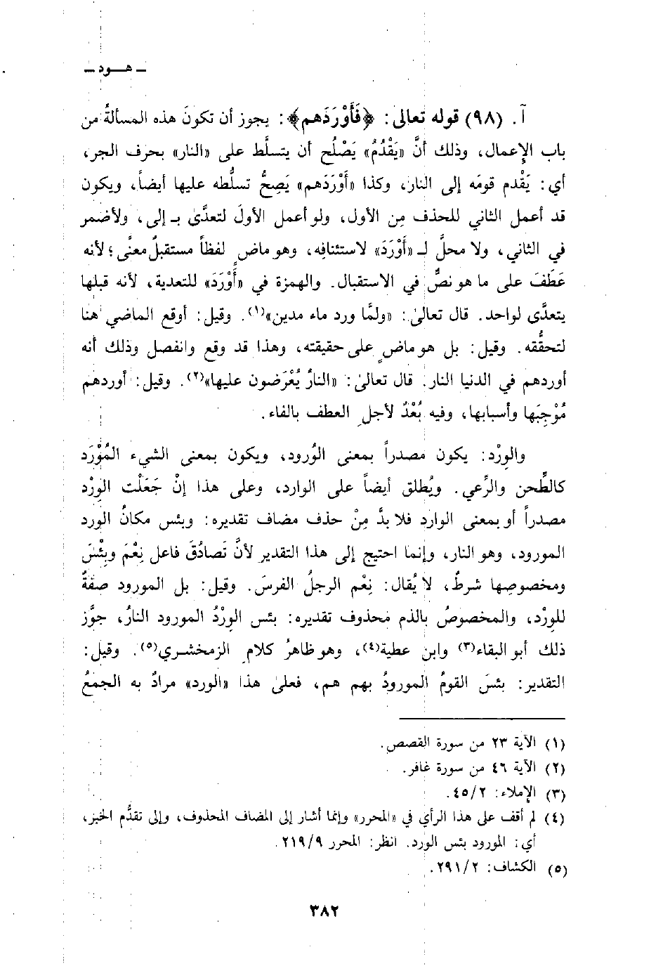 قوله تعالى: {فَأَوْرَدَهُمُ} : يجوز أن تكونَ هذه المسألةُ من باب الإِعمال، وذلك أنَّ «يَقْدُمُ» يَصْلُح أن يتسلَّط على «النار» بحرف الجر، أي: يَقْدم قومَه إلى النار، وكذا «أَوْرَدَهم» يَصِحُّ تسلُّطه عليها أيضاً، ويكون قد أعمل الثاني للحذف مِن الأول، ولو أعمل الأولَ لتعدى ب إلى، ولأضمر في الثاني، ولا محلَّ ل «أَوْرَدَ» لاستئنافِه، وهو ماضٍ لفظاً مستقبلٌ معنىً؛ لأنه عَطَفَ على ما هو نصٌّ في الاستقبال. والهمزة في «أَوْرَدَ» للتعدية، لأنه قبلها يتعدَّى لواحد. قال تعالى: {وَلَمَّا وَرَدَ مَآءَ مَدْيَنَ} وقيل: أوقع الماضي هنا لتحقُّقه. وقيل: بل هو ماضٍ على حقيقته، وهذا قد وقع وانفصل وذلك أنه أوردهم في الدنيا النار. قال تعالى: {النار يُعْرَضُونَ عَلَيْهَا} [غافر: 46] . وقيل: أوردهم مُوْجِبَها وأسبابها، وفيه بُعْدٌ لأجلِ العطف بالفاء.