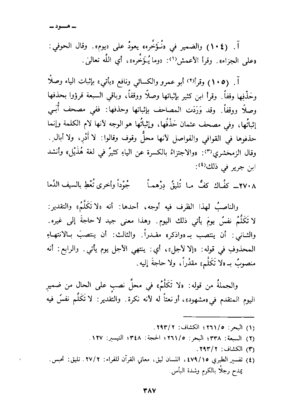 والجملةُ من قوله: «لا تَكَلَّمُ» في محلِّ نصبٍ على الحال من ضمير اليوم المتقدم في «مشهود» ، أو نعتاً له لأنه نكرة. والتقدير: لا تَكَلَّم نفسٌ فيه
