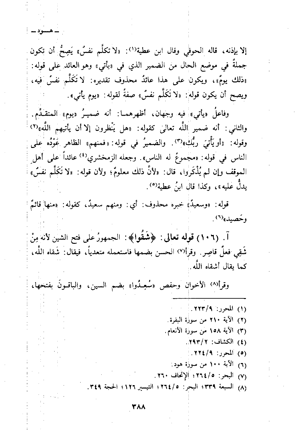 إلا بإذنه، قاله الحوفي وقال ابن عطية: «لا تكلَّم نفسٌ» يَصِحُّ أن تكون جملةً في موضع الحال من الضمير الذي في «يأتي» وهو العائد على قوله: «ذلك يومٌ» ، ويكون على هذا عائدٌ محذوف تقديره: لا تَكَلَّم نفسٌ فيه، ويصح أن يكون قوله: {لاَ تَكَلَّمُ نَفْسٌ} صفةً لقوله: «يوم يأتي» .