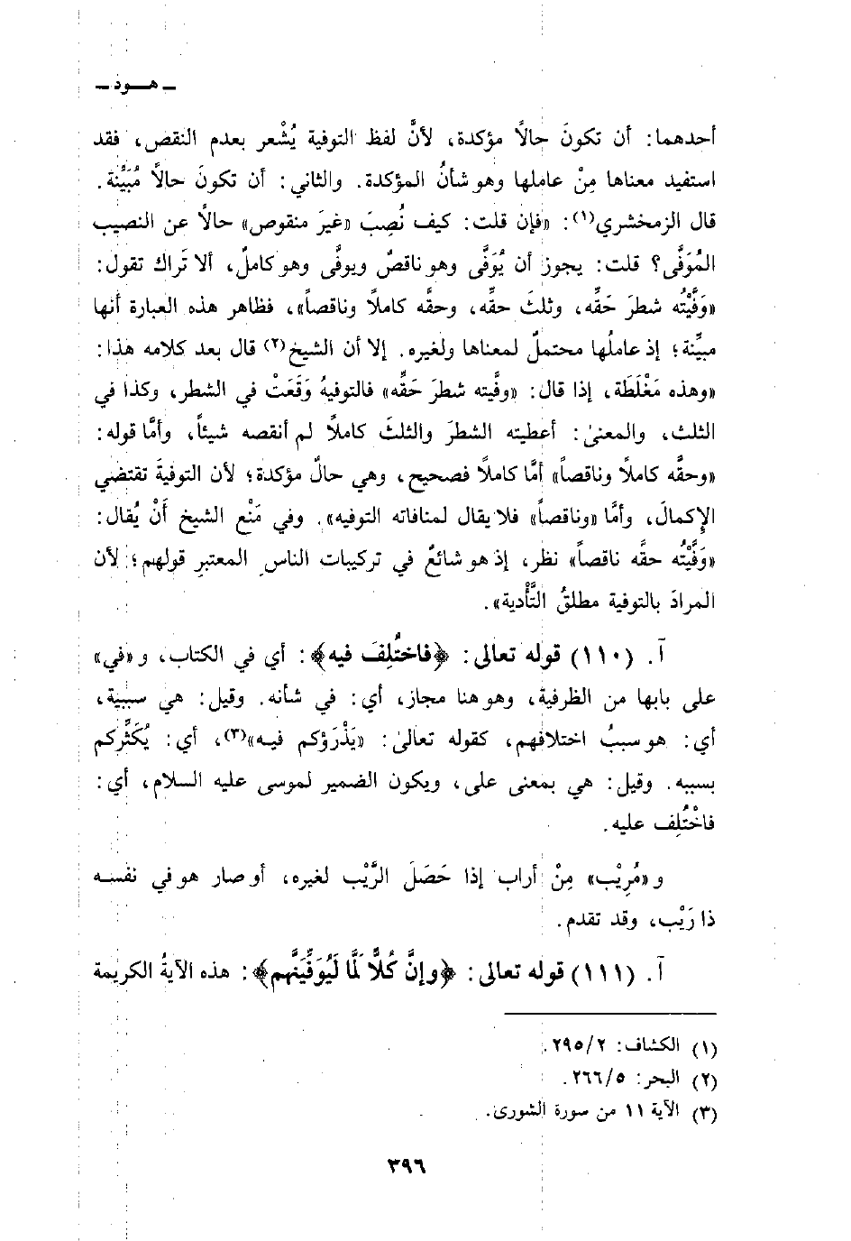 أحدهما: أن تكونَ حالاً مؤكدة، لأنَّ لفظ التوفية يُشْعر بعدم النقص، فقد استفيد معناها مِنْ عاملها وهو شأنُ المؤكدة. والثاني: أن تكونَ حالاً مُبَيِّنة. قال الزمخشري: «فإن قلت: كيف نُصِبَ» غيرَ منقوص «حالاً عن النصيب المُوَفَّى؟ قلت: يجوز أن يُوَفَّى وهو ناقصٌ ويوفَّى وهو كاملٌ، ألا تَراك تقول:» وَفَّيْتُه شطرَ حَقِّه، وثلثَ حقِّه، وحقَّه كاملاً وناقصاً «، فظاهر هذه العبارة أنها مبيِّنة؛ إذ عاملُها محتملٌ لمعناها ولغيره. إلا أن الشيخ قال بعد كلامه هذا:» وهذه مَغْلَطَة، إذا قال: «وفَّيته شطرَ حَقِّه» فالتوفيهُ وَقَعَتْ في الشطر، وكذا في الثلث، والمعنى: أعطيته الشطرَ والثلثَ كاملاً لم أنقصه شيئاً، وأمَّا قوله: «وحقَّه كاملاً وناقصاً» أمَّا كاملاً فصحيح، وهي حالٌ مؤكدة؛ لأن التوفيةَ تقتضي الإِكمالَ، وأمَّا «وناقصاً» فلا يقال لمنافاته التوفيه «. وفي مَنْع الشيخ أَنْ يُقال:» وَفَّيْتُه حقَّه ناقصاً «نظر، إذ هو شائعٌ في تركيبات الناسِ المعتبرِ قولهم؛ لأن المرادَ بالتوفية مطلقُ التَّأْدية» .