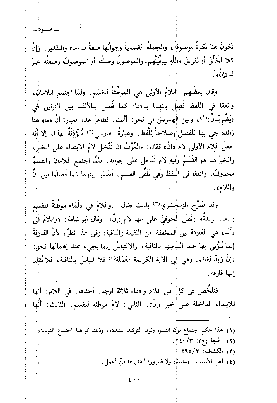 وقد صَرَّح الزمخشري بذلك فقال:» واللامُ في «لَمَا» موطِّئةٌ للقسم و «ما» مزيدةٌ «ونَصَّ الحوفيُّ على أنها لام» إنْ «. وقال أبو شامة:» واللامُ في «لَمَا» هي الفارقة بين المخففة من الثقيلة والنافية «وفي هذا نظرٌ؛ لأنَّ الفارقةَ إنما يؤتى بها عند التباسِها بالنافية، والالتباسُ إنما يجيء عند إهمالها نحو:» إنْ زيدٌ لقائم «وهي في الآية الكريمة مُعْمَلة فلا التباسَ بالنافية، فلا يُقال إنها فارقة.
