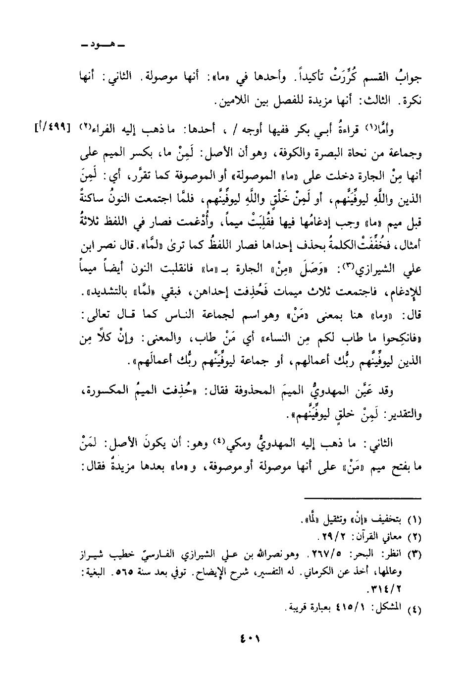 وأمَّا قراءةُ أبي بكر ففيها أوجه/، أحدها: ما ذهب إليه الفراء وجماعة من نحاة البصرة والكوفة، وهو أن الأصل: لَمِنْ ما، بكسر الميم على أنها مِنْ الجارة دخلت على «ما» الموصولة «أو الموصوفة كما تقرَّر، أي: لَمِنَ الذين واللَّهِ ليوفِّيَنَّهم، أو لَمِنْ خَلْقٍ واللَّهِ ليوفِّينَّهم، فلمَّا اجتمعت النونُ ساكنةً قبل ميم» ما «وجب إدغامُها فيها فقُلِبَتْ ميماً، وأُدْغمت فصار في اللفظ ثلاثةُ أمثال، فخُفِّفَتْ الكلمةُ بحذف إحداها فصار اللفظُ كما ترى» لمَّا «. قال نصر ابن علي الشيرازي:» وَصَلَ «مِنْ» الجارة ب «ما» فانقلبت النون أيضاً ميماً للإِدغام، فاجتمعت ثلاث ميمات فَحُذِفت إحداهن، فبقي «لمَّا» بالتشديد «. قال: و» ما «هنا بمعنى» مَنْ «وهو اسم لجماعة الناس كما قال تعالى: {فانكحوا مَا طَابَ لَكُمْ مِّنَ النسآء} أي مَنْ طاب، والمعنى: وإنْ كلاً مِن الذين ليوفِّينَّهم ربُّك أعمالهم، أو جماعة ليوفِّيَنَّهم ربُّك أعمالَهم» .