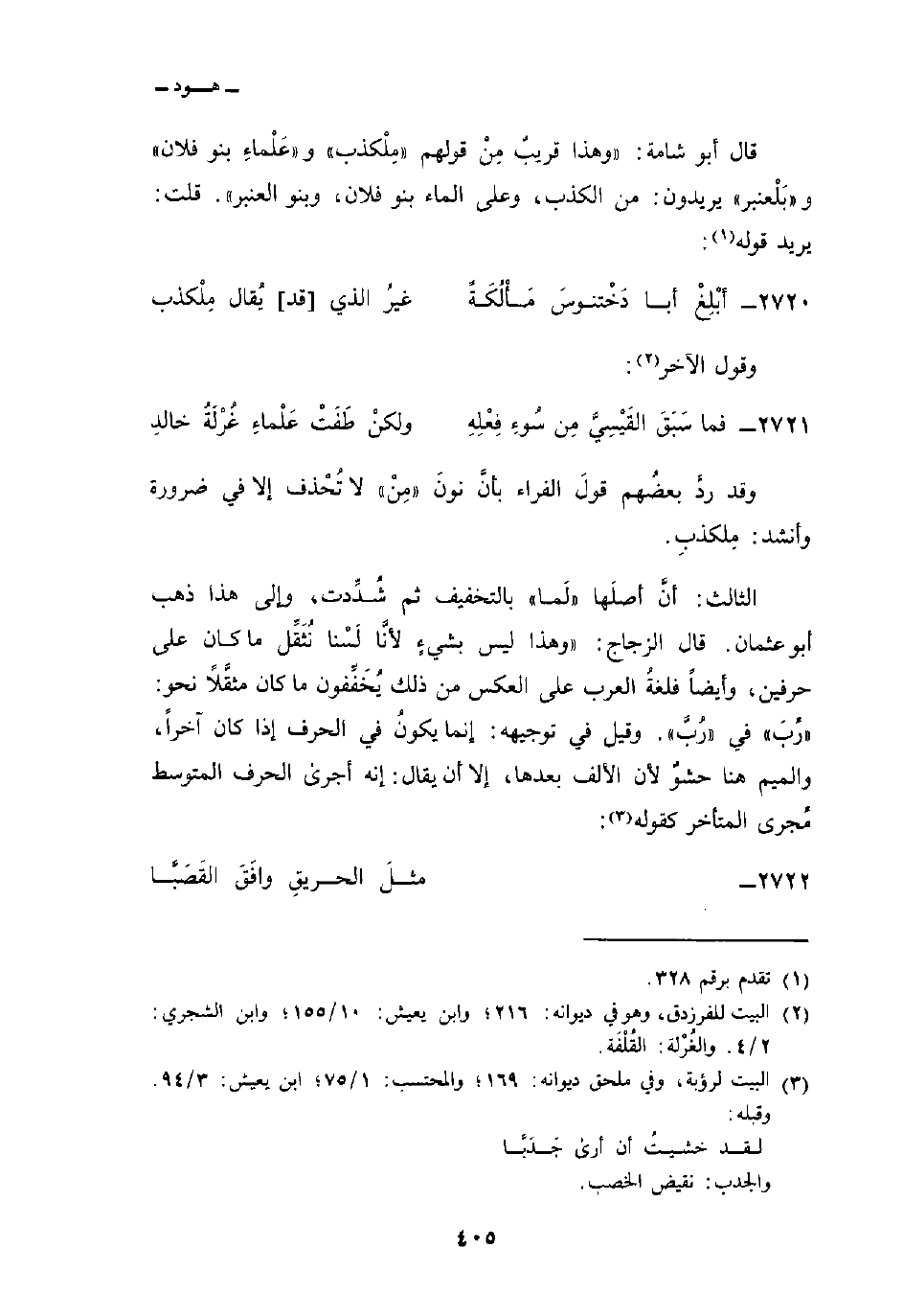 وقد ردَّ بعضُهم قولَ الفراء بأنَّ نونَ «مِنْ» لا تُحْذف إلا في ضرورة وأنشد: مِلكذبِ.