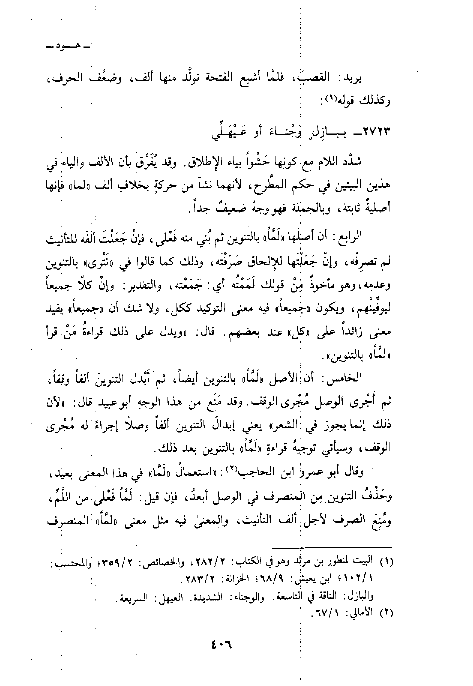 2723 - ببازِلٍ وَجْناءَ أو عَيْهَلِّي ... شدَّد اللام مع كونِها حَشْواً بياء الإِطلاق. وقد يُفَرَّق بأن الألف والياء في هذين البيتين في حكم المطَّرح، لأنهما نشآ من حركةٍ بخلافٍ ألف» لما «فإنها أصليةٌ ثابتة، وبالجملة فهو وجهٌ ضعيفٌ جداً.