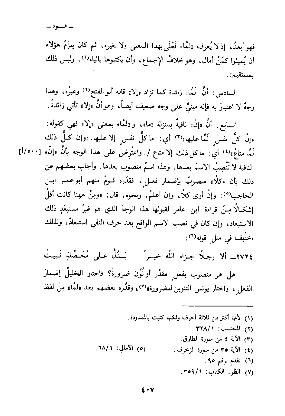 السابع: أنَّ «إنْ» نافيةٌ بمنزلة «ما» ، و «لمَّا» بمعنى «إلا» فهي كقوله: {إِن كُلُّ نَفْسٍ لَّمَّا عَلَيْهَا} [الطارق: 4] أي: ما كلُّ نفسٍ إلا عليها، {وَإِن كُلُّ ذَلِكَ لَمَّا مَتَاعُ} [الزخرف: 35] أي: ما كل ذلك إلا متاع/. واعتُرِض على هذا الوجه بأنَّ «إنْ» النافية لا تَنْصِبُ الاسمَ بعدها، وهذا اسمٌ منصوب بعدها. وأجاب بعضهم عن ذلك بأن «كلاً» منصوبٌ بإضمار فعلٍ، فقدَّره قومٌ منهم أبو عمر ابن الحاجب: وإنْ أرى كلاً، وإن أعلمُ، ونحوه، قال: «ومِنْ ههنا كانت أقلَّ إشكالاً مِنْ قراءة ابن عامر لقبولها هذا الوجهَ الذي هو غيرُ مستبعَدٍ ذلك الاستبعاد، وإن كان في نصب الاسم الواقع بعد حرف النفي استبعادٌ، ولذلك اختلُفِ في مثلِ قوله: