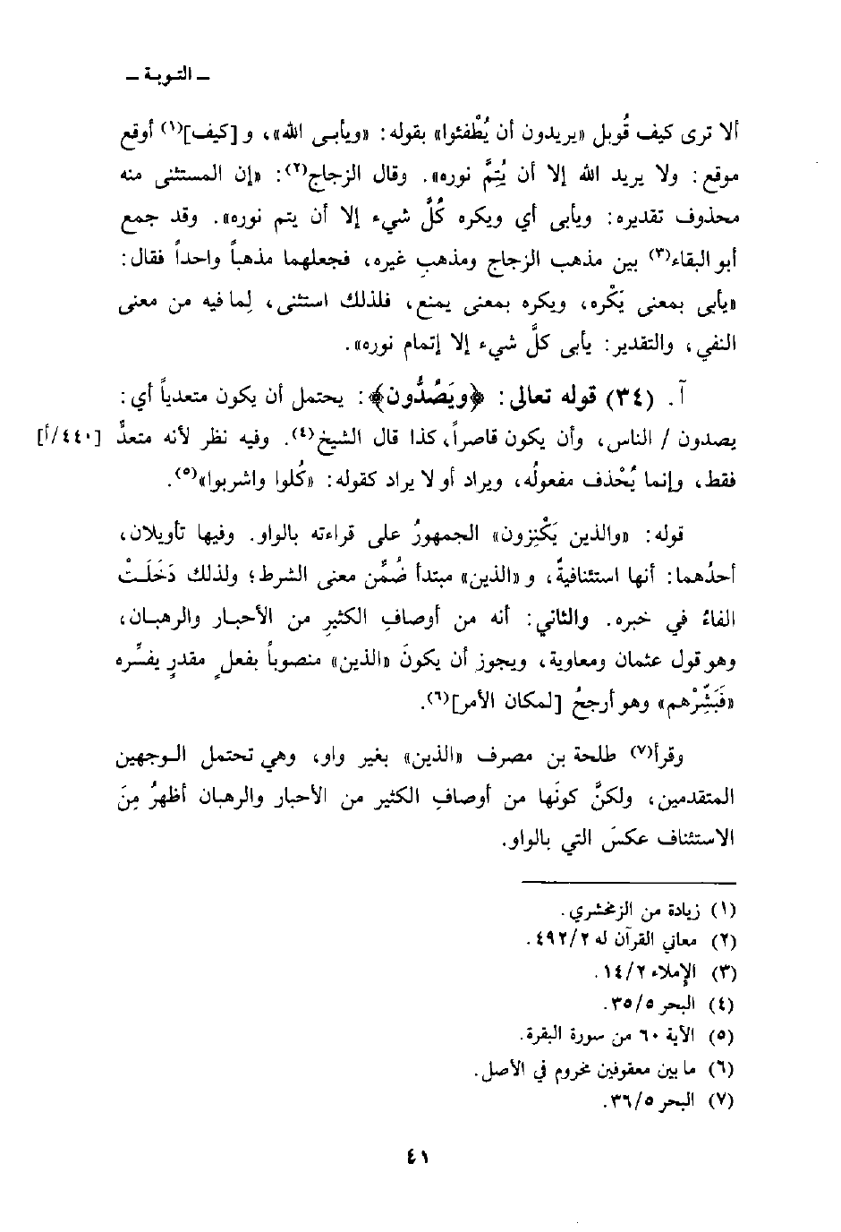 وقرأ طلحة بن مصرف «الذين» بغير واو، وهي تحتمل الوجهين المتقدمين، ولكنَّ كونَها من أوصافِ الكثير من الأحبار والرهبان أظهرُ مِنَ الاستئناف عكسَ التي بالواو.