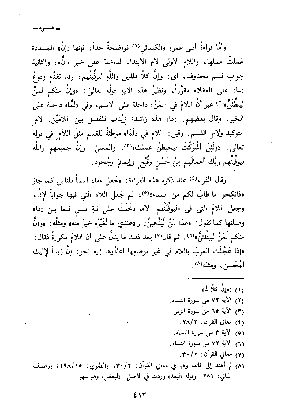 وقال الفراء عند ذكره هذه القراءة: «جَعَل» ما «اسماً للناس كما جاز {فانكحوا مَا طَابَ لَكُمْ مِّنَ النسآء} [النساء: 3] ، ثم جَعَلَ اللامَ التي فيها جواباً لإِنَّ، وجعل اللامَ التي في» ليوفِّيَنَّهم «لاماً دَخَلَتْ على نيةِ يمينٍ فيما بين» ما «وصلتِها كما تقول:» هذا مَنْ لَيَذْهَبَنَّ «، و» عندي ما لَغَيْرُه خيرٌ منه «ومثلُه: {وَإِنَّ مِنْكُمْ لَمَن لَّيُبَطِّئَنَّ} [النساء: 72] . ثم قال بعد ذلك ما يدلُّ على أن اللامَ مكررةٌ فقال:» إذا عَجَّلَت العربُ باللام في غيرِ موضعِها أعادُوها إليه نحو: إنَّ زيداً لإِليك لمُحْسن، ومثله: