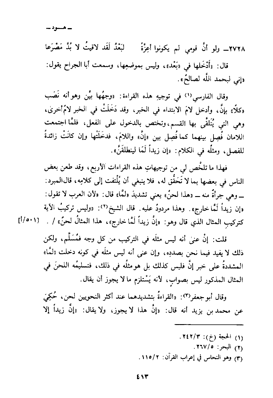 فهذا ما تلخَّص لي من توجيهاتِ هذه القراءات الأربع، وقد طعن بعض الناس في بعضها بما لا تَحَقُّق له، فلا ينبغي أن يُلْتفت إلى كلامِه، قال المبرد: وهي جرأةٌ منه «هذا لحنٌ» يعني تشديدَ «لمَّا» قال: «لأن العرب لا تقول:» إن زيداً لَمَّا خارج «.