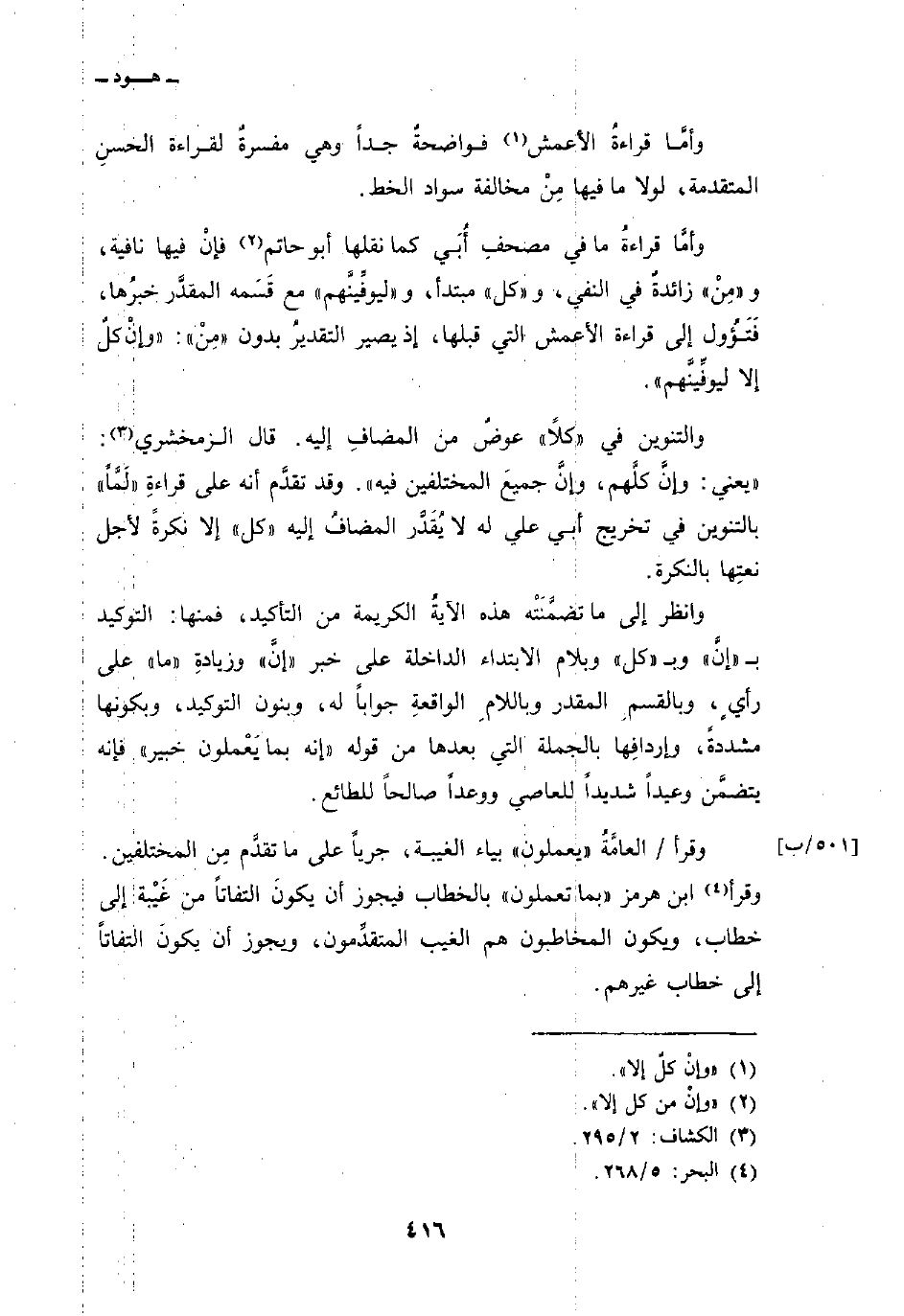 وأمَّا قراءةُ ما في مصحفِ أُبَي كما نقلها أبو حاتم فإنْ فيها نافية، و «مِنْ» زائدةٌ «في النفي، و» كل «مبتدأ، و» ليوفِّينَّهم «مع قَسَمه المقدَّر خبرُها، فَتَؤُول إلى قراءة الأعمش التي قبلها، إذ يصير التقديرُ بدون» مِنْ «: {وإنْ كلٌ إلا ليوفِّينَّهم} .