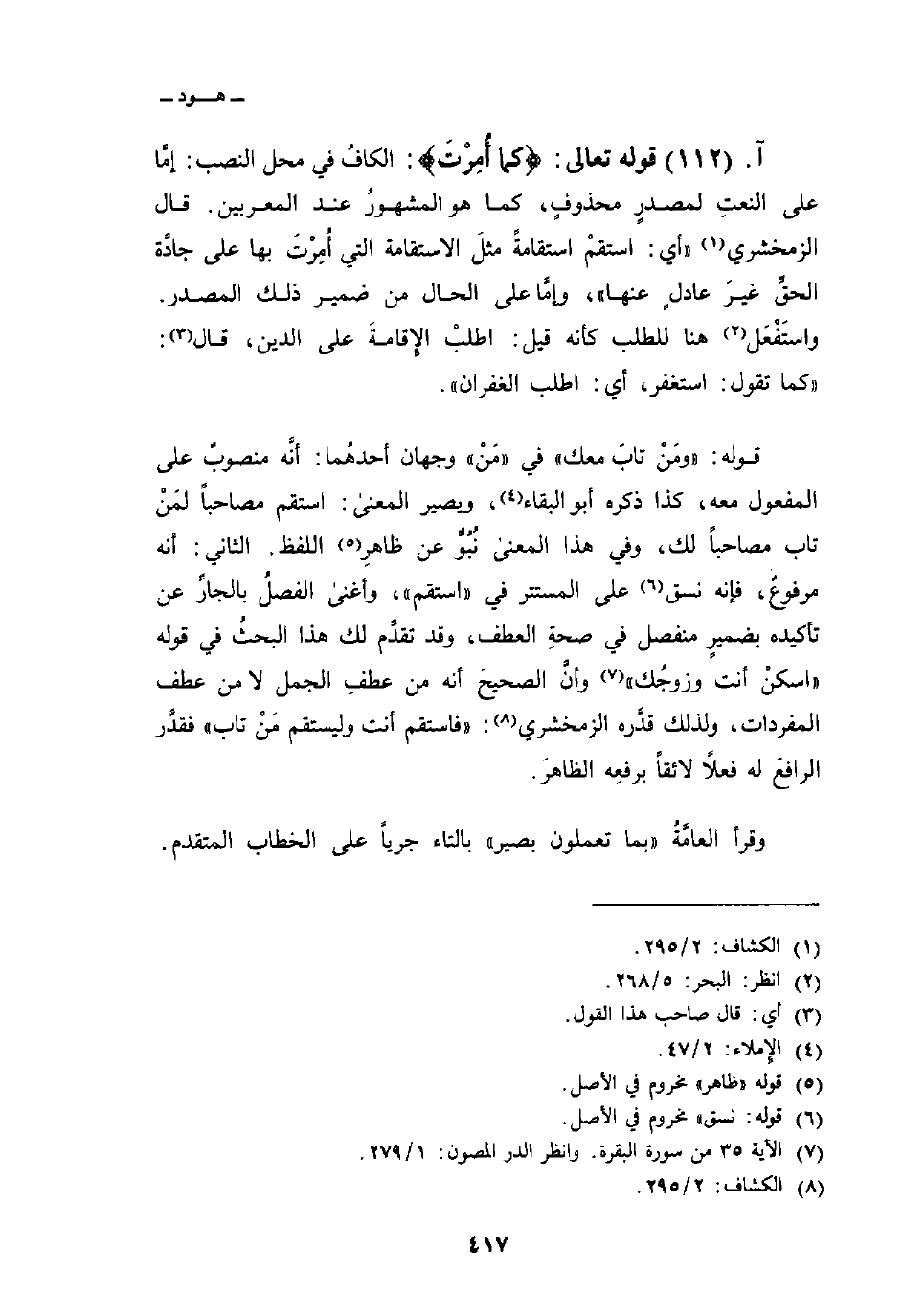 قوله تعالى: {كَمَآ أُمِرْتَ} : الكافُ في محل النصب: إمَّا على النعتِ لمصدرٍ محذوفٍ، كما هو المشهورُ عند المعربين. قال الزمخشري: «أي: استقمْ استقامةً مثلَ الاستقامة التي أُمِرْتَ بها على جادَّة الحقِّ غيرَ عادلٍ عنها» ، وإمَّا على الحال من ضمير ذلك المصدر. واستَفْعَل هنا للطلب كأنه قيل: اطلبْ الإِقامةَ على الدين، قال: «كما تقول: استغفر، أي: اطلب الغفران» .