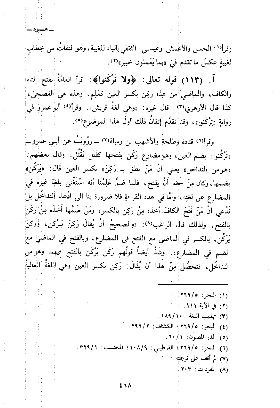 وقرأ قتادة وطلحة والأشهب بن رميلة ورُوِيَتْ عن أبي عمرو «تَرْكُنوا» بضم العين، وهو مضارع رَكَن بفتحها كقَتَل يَقْتُل. وقال بعضهم: «هو من التداخل» يعني أنَّ مَنْ نطق ب «رَكِنَ» بكسر العين قال: «يَرْكُن» بضمها، وكان مِنْ حقه أَنْ يفتح، فلما ضَمَّا عَلِمْنا أنه اسْتَغْنى بلغةِ غيره في المضارع عن لغتِه، وأمَّا في هذه القراءةِ فلا ضرورة بنا إلى ادِّعاء التداخُل بل نَدَّعي أنَّ مَنْ فَتَحَ الكافَ أخذه مِنْ رَكِن بالكسر، ومَنْ ضَمَّها أَخَذَه مِنْ ركَن بالفتح، ولذلك قال الراغب: «والصحيحُ أنْ يُقالَ رَكِنَ يَرْكَن، وركَنَ يَرْكُن، بالكسر في الماضي مع الفتح في المضارع، وبالفتح في الماضي مع الضم في المضارع» . وشَذَّ أيضاً قولُهم رَكَن يَرْكَن بالفتح فيهما وهو من التداخُل، فتحصَّل مِنْ هذا أن يُقَالَ: رَكِن بكسر العين وهي اللغةُ العاليةُ