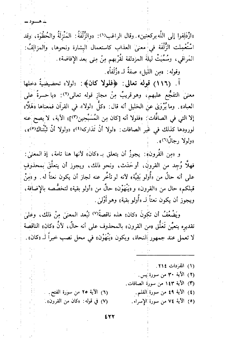 و» مِن القُرون «: يجوزُ أن يتعلق ب» كان «لأنها هنا تامة، إذ المعنى: فهلاَّ وُجِد من القرون، أو حَدَث، ونحو ذلك، ويجوز أن يتعلَّقَ بمحذوفٍ على أنه حالٌ من» أُولو بَقِيَّة «لأنه لو تأخَّر عنه لجاز أن يكون نعتاً له. و» مِنْ قبلكم «حال من» القرون «و» يَنْهَوْن «حالٌ من» أولو بقية «لتخصُّصه بالإِضافة، ويجوز أن يكون نعتاً ل» أُولوا بقية «وهو أولى.