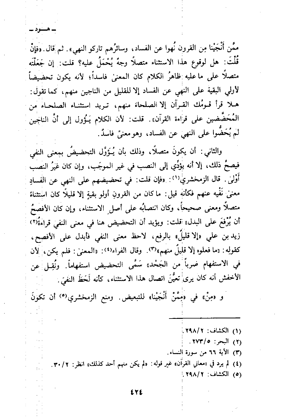 ممَّن أَنْجَيْنا مِن القرون نُهوا عن الفساد، وسائرُهم تاركوا النهي» . ثم قال. «فإن قُلْتَ: هل لوقوع هذا الاستثناء متصلاً وجهٌ يُحْمَلُ عليه؟ قلت: إن جَعَلْتَه متصلاً على ما عليه ظاهرُ الكلام كان المعنى فاسداً؛ لأنه يكون تحضيضاً لأولي البقية على النهي عن الفساد إلا للقليل من الناجين منهم، كما تقول: هلا قرأ قومُك القرآن إلا الصلحاءَ منهم، تريد استثناء الصلحاء من المُحَضَّضين على قراءة القرآن» . قلت: لأن الكلام يَؤُول إلى أنَّ الناجين لم يُحَضُّوا على النهي عن الفساد، وهو معنىً فاسدٌ.
