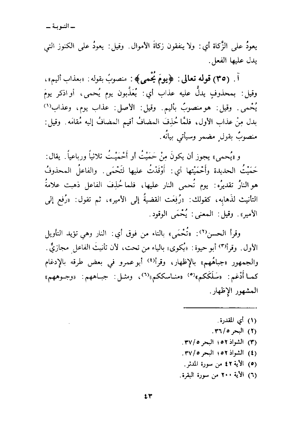 وقرأ الحسن: «تُحْمَى» بالتاء من فوق أي: النار وهي تؤيد التأويل الأول. وقرأ أبو حيوة: «يُكوى» بالياء من تحت، لأن تأنيثَ الفاعلِ مجازيٌّ. والجمهور «جباهُهم» بالإِظهار، وقرأ أبو عمرو في بعض طرقه بالإِدغام كما أَدْغم: {سَلَكَكُمْ} [المدثر: 42] {مَّنَاسِكَكُمْ} [البقرة: 200] ، ومثل: جباههم: «وجوههم» المشهور الإِظهار.