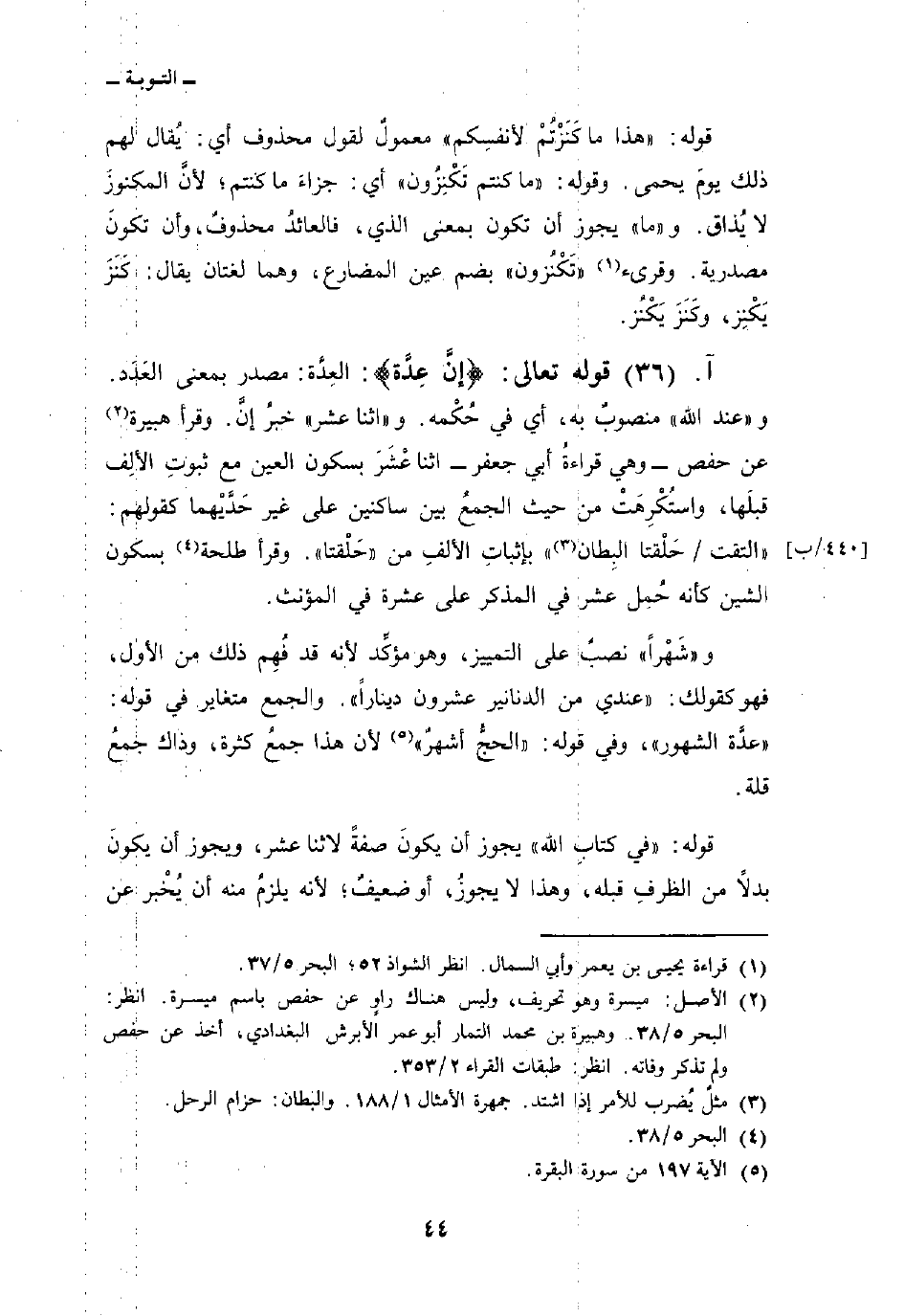 قوله تعالى: {إِنَّ عِدَّةَ} : العِدَّة: مصدر بمعنى العَدَد. و «عند الله» منصوبٌ به، أي في حُكْمه. و «اثنا عشر» خبرُ إنَّ. وقرأ هبيرة عن حفص وهي قراءةُ أبي جعفر اثنا عْشَرَ بسكون العين مع ثبوتِ الألِف قبلَها، واستُكْرِهَتْ من حيث الجمعُ بين ساكنين على غير حَدَّيْهما كقولهم: «التقت/ حَلْقتا البِطان» بإثباتِ الألفِ من «حَلْقتا» . وقرأ طلحة بسكون الشين كأنه حُمِل عشر في المذكر على عشرة في المؤنث.