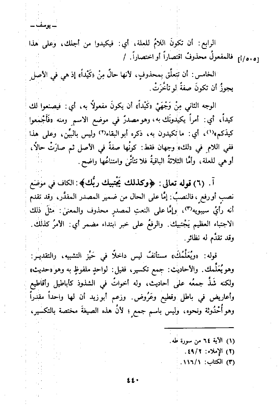 قوله: {وَيُعَلِّمُكَ} مستأنفٌ ليس داخلاً في حَيِّز التشبيه، والتقدير: وهو يُعَلِّمك. والأحاديث: جمع تكسير، فقيل: لواحدٍ ملفوظٍ به وهو «حديث» ولكنه شَذَّ جمعُه على أحاديث، وله أخواتٌ في الشذوذ كأباطيل وأقاطيع وأعاريض في باطل وقطيع وعَرُوض. وزعم أبو زيد أن لها واحداً مقدراً وهو أُحْدُوثة ونحوه، وليس باسم جمعٍ؛ لأنَّ هذه الصيغةَ مختصة بالتكسير،