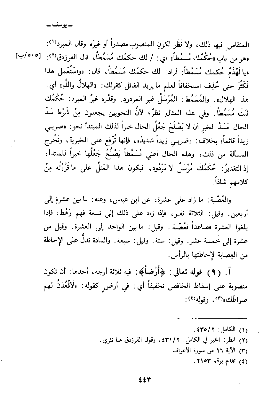 المنقاسِ فيها ذلك، ولا نَظَر لكونِ المنصوب مصدراً أو غيرَه. وقال المبرد:» هو من باب «حُكْمُك مُسَمَّطاً» أي: / لك حكمُك مُسَمَّطاً، قال الفرزدق: «يا لَهْذَمُ حُكمك مُسَمَّطاً» أراد: لك حكمُك مُسَمَّطاً، قال: «واسْتُعْمل هذا فَكَثُرَ حتى حُذِف استخفافاً لعلم ما يريد القائل كقولك:» الهلالُ واللَّهِ «أي: هذا الهلال» . والمُسَمَّط: المُرْسَلُ غير المردودِ. وقدَّره غيرُ المبرد: حُكْمُك ثَبَتَ مُسَمَّطاً. وفي هذا المثالِ نظرٌ؛ لأنَّ النحويين يجعلون مِنْ شَرْط سَدِّ الحالِ مَسَدَّ الخبرِ أن لا يَصْلُحَ جَعْلُ الحال خبراً لذلك المبتدأ نحو: «ضربي زيداً قائماً» بخلاف: «ضربي زيداً شديدٌ» ، فإنها تُرْفع على الخبرية، وتَخْرج المسألة من ذلك، وهذه الحال أعني مُسَمَّطاً يَصْلُحُ جَعْلُها خبراً للمبتدأ، إذ التقدير: حُكْمُكَ مُرْسَلٌ لا مَرْدُود، فيكون هذا المَثَلُ على ما قَرَّرْتُه مِنْ كلامهم شاذاً.
