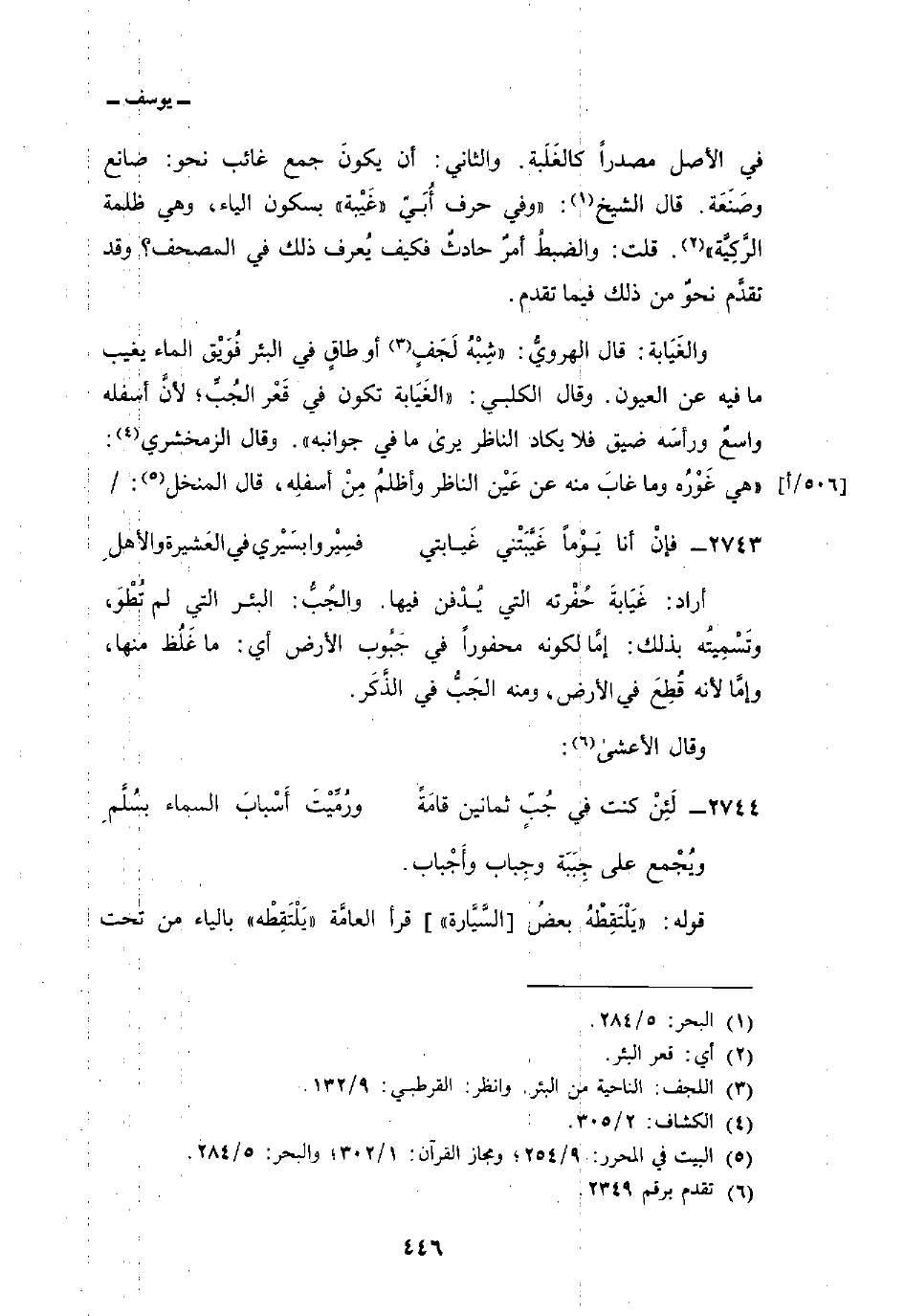 والغَيَابة: قال الهرويٌّ: «شِبْهُ لَجَفٍ أو طاقٍ في البئر فُوَيْق الماء يغيب ما فيه عن العيون. وقال الكلبي:» الغَيَابة تكون في قَعْر الجُبِّ؛ لانَّ أسفله واسعٌ ورأسَه ضيق فلا يكاد الناظر يرى ما في جوانبه «. وقال الزمخشري:» هي غَوْرُه وما غابَ منه عن عَيْن الناظر وأظلمُ مِنْ أسفلِه، قال المنخل: /