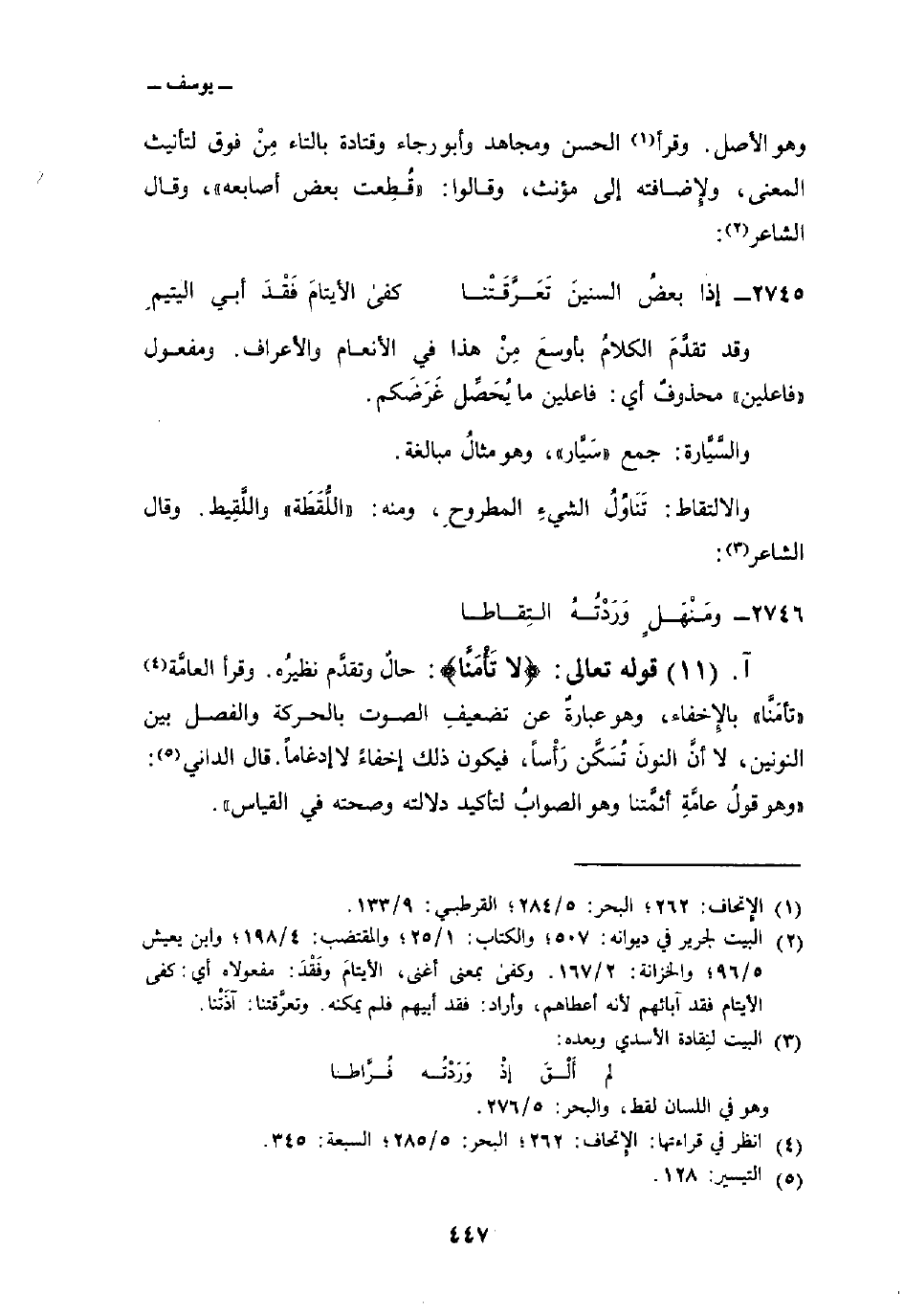قوله تعالى: {لاَ تَأْمَنَّا} : حالٌ وتقدَّم نظيرُه. وقرأ العامَّة «تأمَنَّا» بالإِخفاء، وهو عبارةٌ عن تضعيفِ الصوت بالحركة والفصل بين النونين، لا أنَّ النونَ تُسَكَّن رَأْساً، فيكون ذلك إخفاءً لا إدغاماً. قال الداني: «وهو قولُ عامَّةِ أئمَّتنا وهو الصوابُ لتأكيد دلالته وصحته في القياس» .