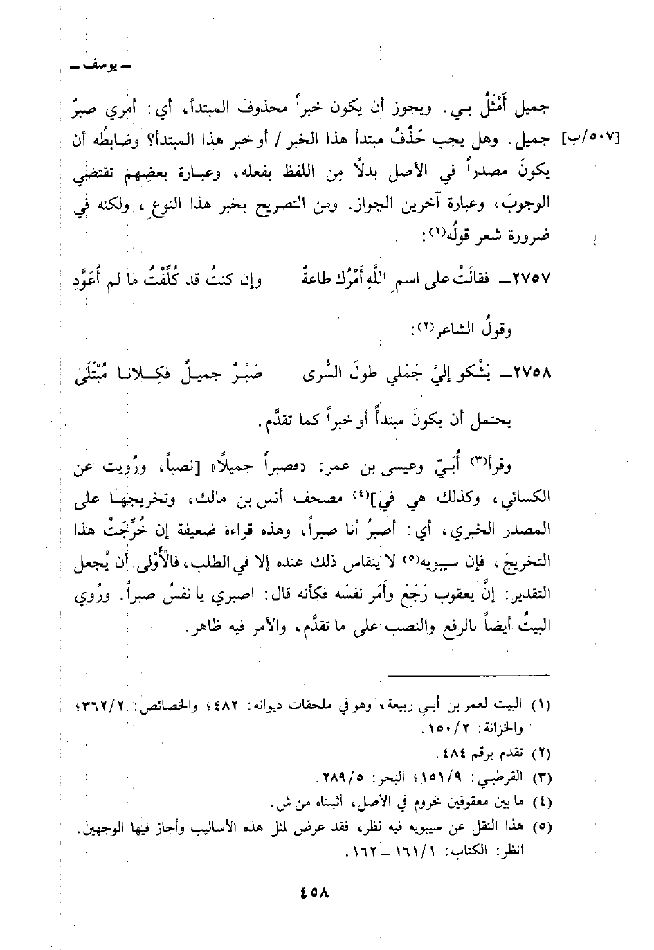 وقرأ أُبَيّ وعيسى بن عمر: «فصبراً جميلاً» [نصباً، ورُويت عن الكسائي، وكذلك هي في] مصحف أنس بن مالك، وتخريجها على المصدر الخبري، أي: أصبرُ أنا صبراً، وهذه قراءة ضعيفة إن خُرِّجَتْ هذا التخريجَ، فإن سيبويه لا ينقاس ذلك عنده إلا في الطلب، فالأَوْلى أن يُجعل التقدير: إنَّ يعقوب رَجَعَ وأَمَر نفسَه فكأنه قال: اصبري يا نفسُ صبراً. ورُوري البيتُ أيضاً بالرفع والنصب على ما تقدَّم، والأمر فيه ظاهر.
