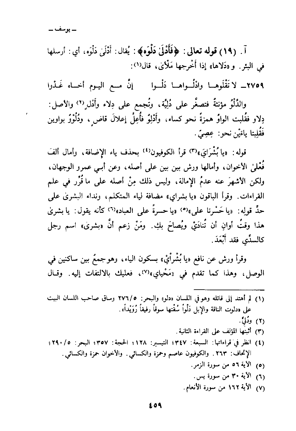 قوله: {يابشراى} قرأ الكوفيون بحذف ياء الإِضافة، وأمال ألفَ فعلى الأخوان، وأمالها ورش بين بين على أصله، وعن أبي عمرو الوجهان، ولكن الأشهرَ عنه عدمُ الإِمالة، وليس ذلك مِنْ أصله على ما قُرِّر في علم القراءات. وقرأ الباقون «يا بشراي» مضافة لياء المتكلم، ونداء البشرى على حدِّ قولِه: {ياحسرتا على} [الزمر: 56] {ياحسرة عَلَى العباد} [يس: 30] كأنه يقول: يا بشرى هذا وقتُ أوانِ أن تُنادَيْ ويُصاحَ بكِ. ومَنْ زعم أنَّ «بشرى» اسم رجل كالسدِّي فقد أَبْعَدَ.